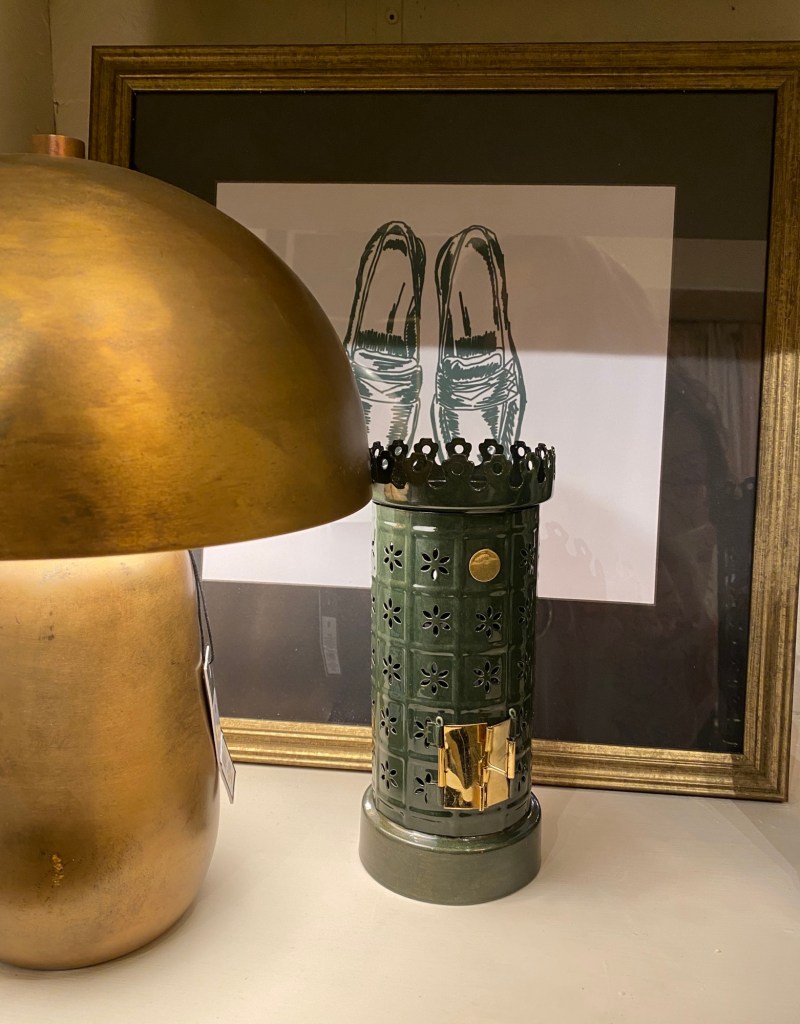 Vi har packat upp små kakelugnar oxå.. Härligt gröna ljuslyktor av plåt. blev mysigt här vid svamplampan av mässing och tavlan med de gröna skorna.