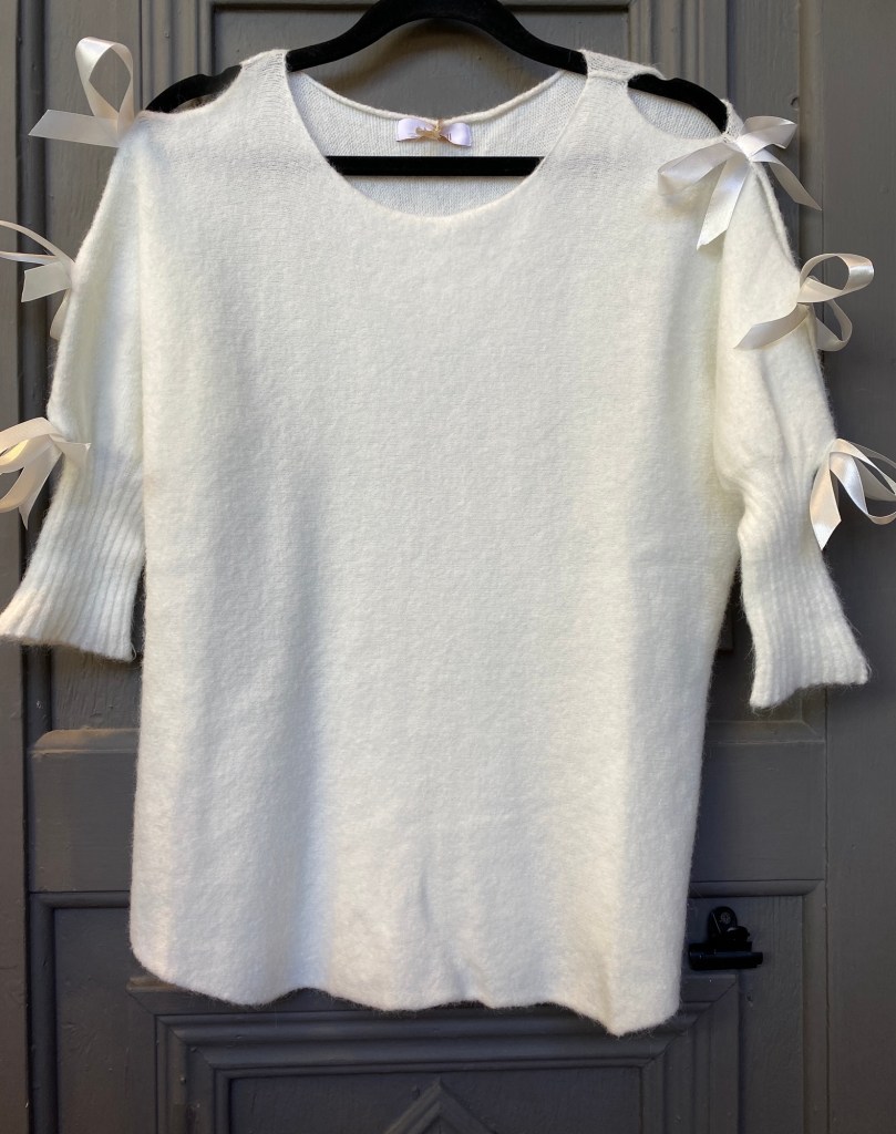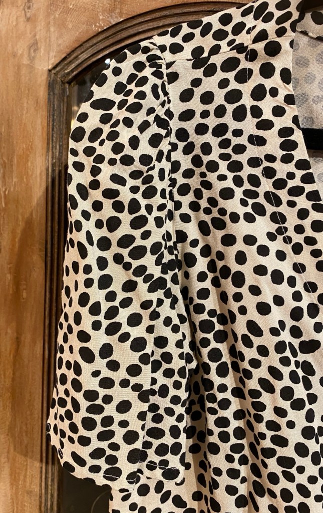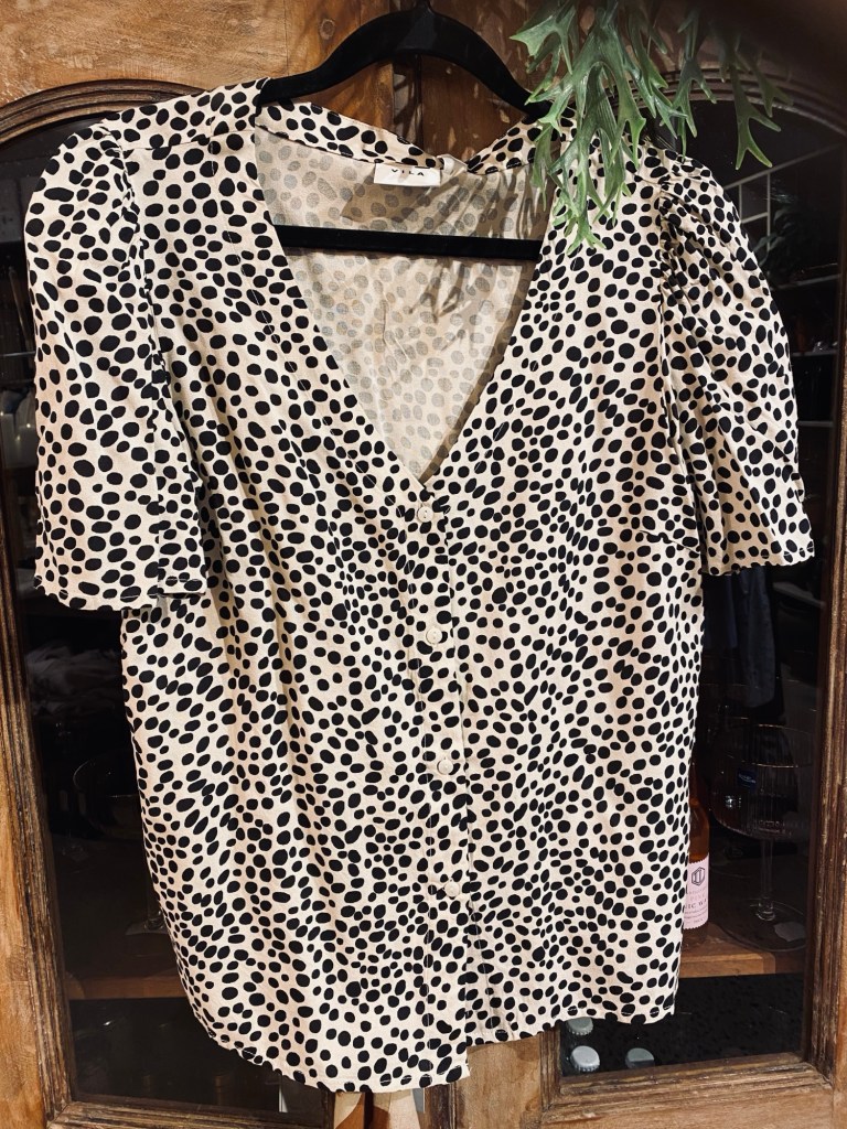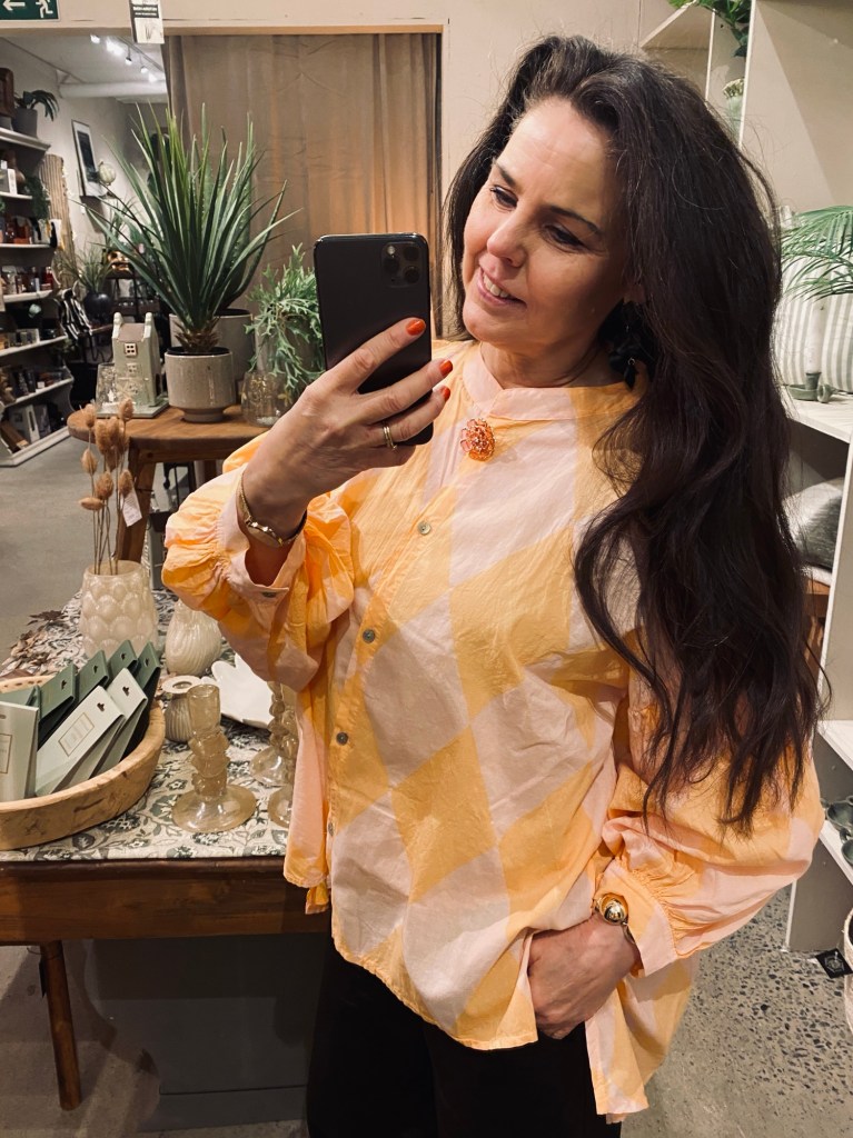 Jag hade en av mina nya favoritplagg på mej.Så fräscha färger i ett klassiskt mönster. Modellen är one size och är något längre bak än fram. Den har ett snyggt veckat ärmslut och knappar hela vägen fram.Toppad med en knappbrosch i en sprakande färg.