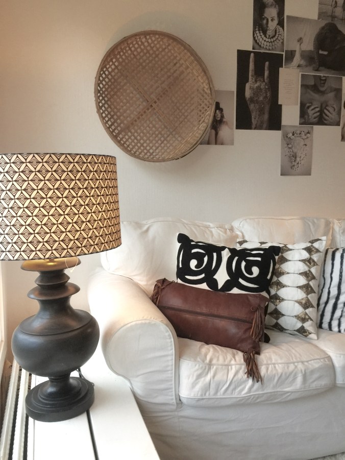 Hemma har den nya svarta lampfoten fått en ny skärm,har inte bestämt vilken jag gillar mest,den mönstrade eller den i grå sammet,tror att vinnaren blir sammetsskärmen,kanske att jag limmar på en fin frans av glaspärlor som jag hittade igår när jag röjde bland sytillnehören,tror att det skulle bli fint.