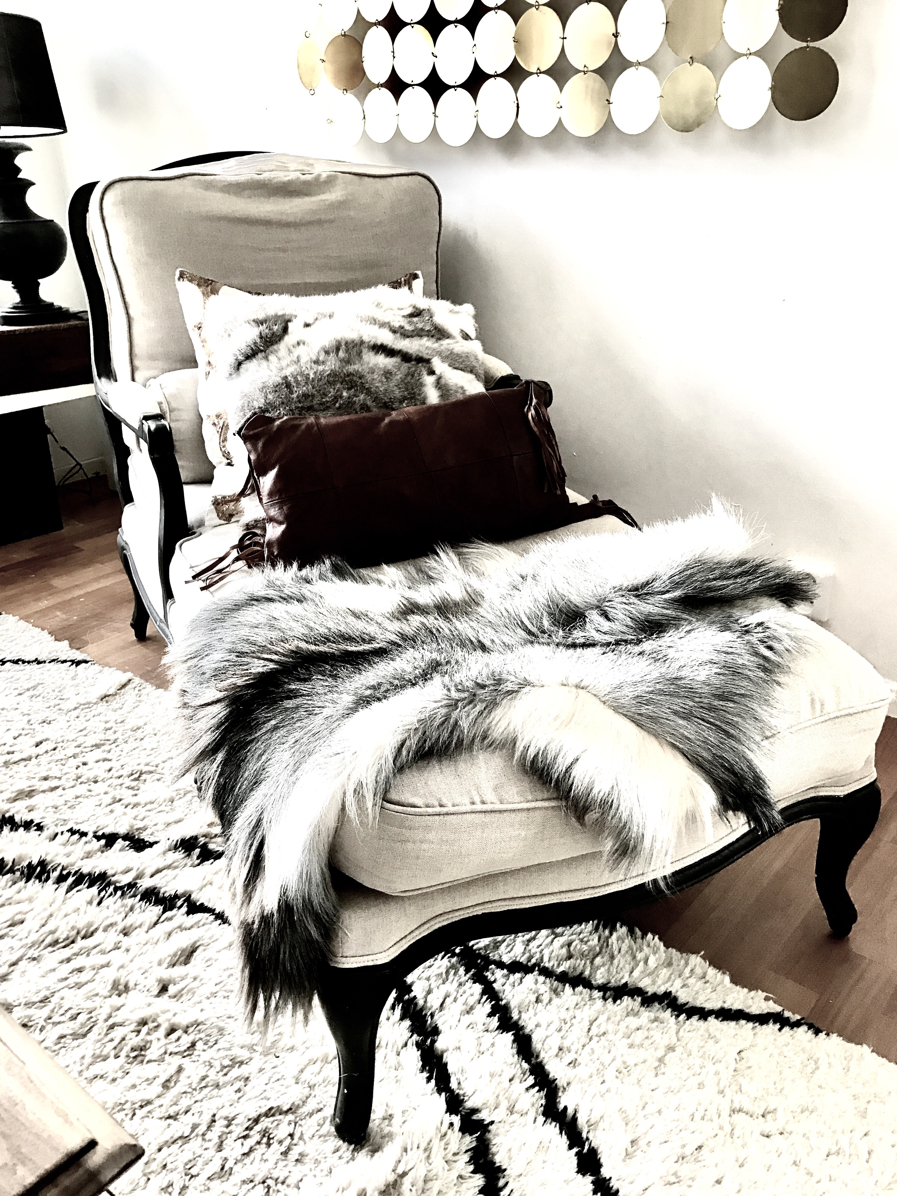 Den ena schäslongen har jag ännu inte bestämt om jag tycker om eller inte, målade om den förra året,från vitmålade trädetaljer till matt svart, likaså fåtöljen.