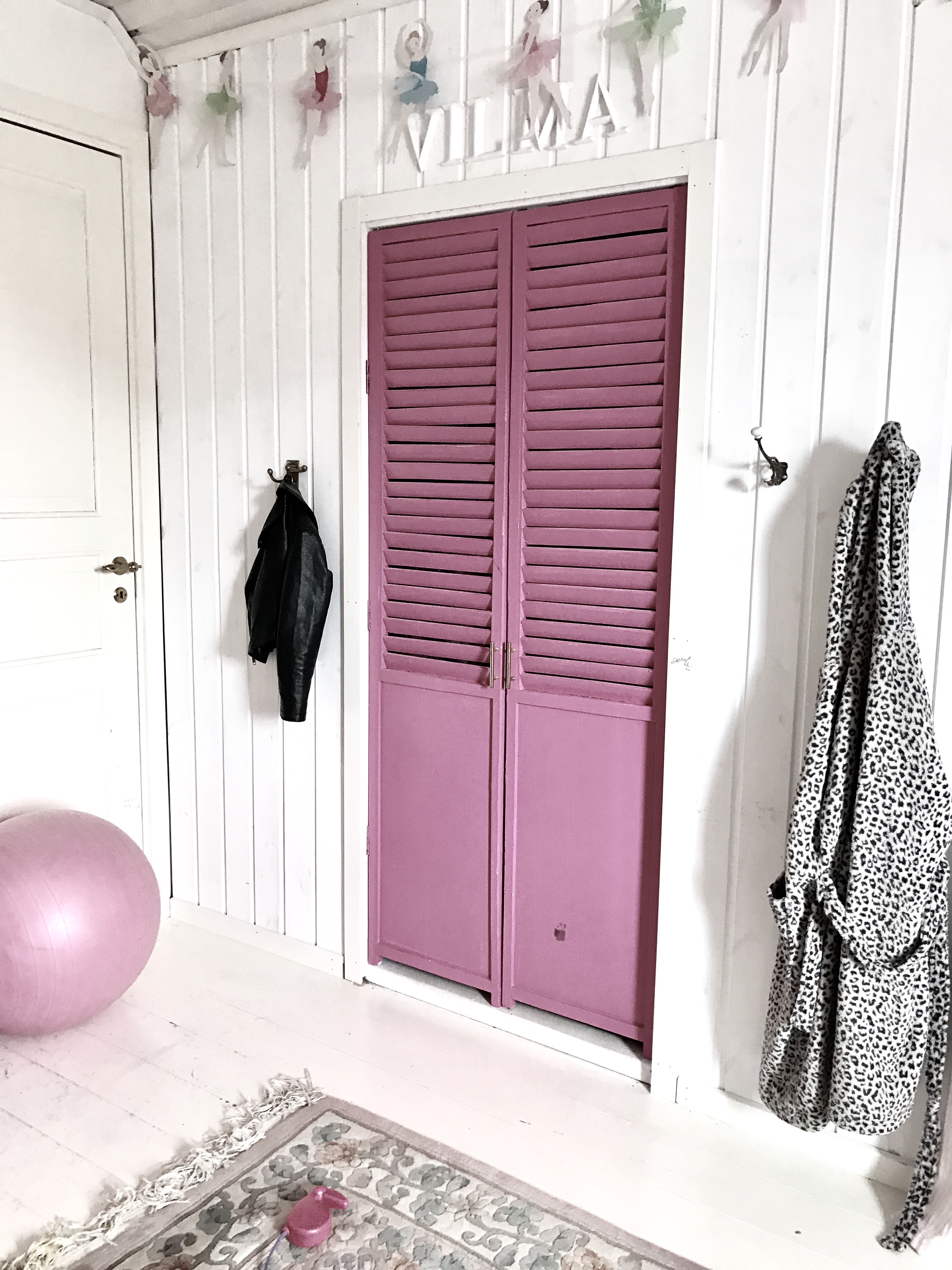 [Innanför pardörrarna ,som egentligen är delar av en vikvägg, finns Vilmas lilla walk in closet]. Vilma har pratat länge om att ha mindre saker på sitt rum ,hon gillar inte hyllor och vill helst inte ha någon förvaring men har aldrig känt att hon kan ta bort något, en knepig kombo det där.