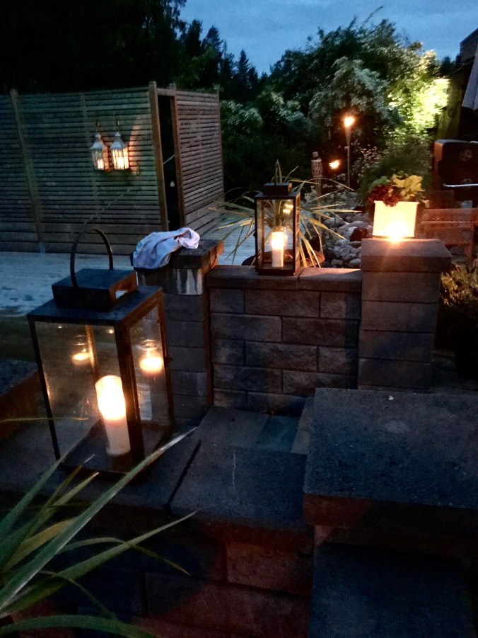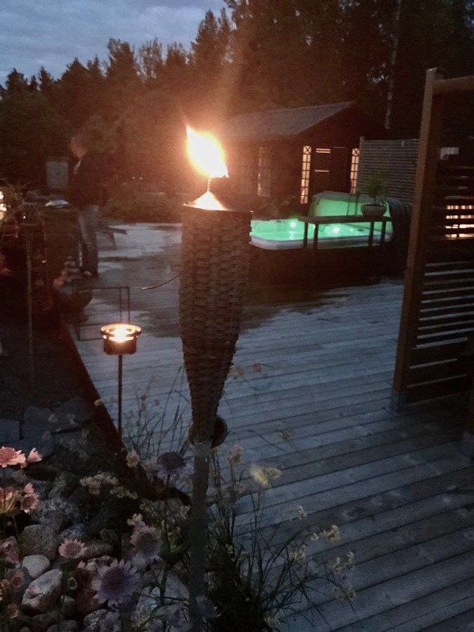 När alla gjort sina ansiktsmasker, hårinpackningar och målat naglar klart serverade Åsa-på-landet sin hemgjorda rabarberpaj med vaniljglass, helt underbart gott,ute var det mörkt och bara facklorna, ljuslyktorna och marsallerna lyste upp julikvällen,sommarmagi när den är som bäst om du frågar mej.