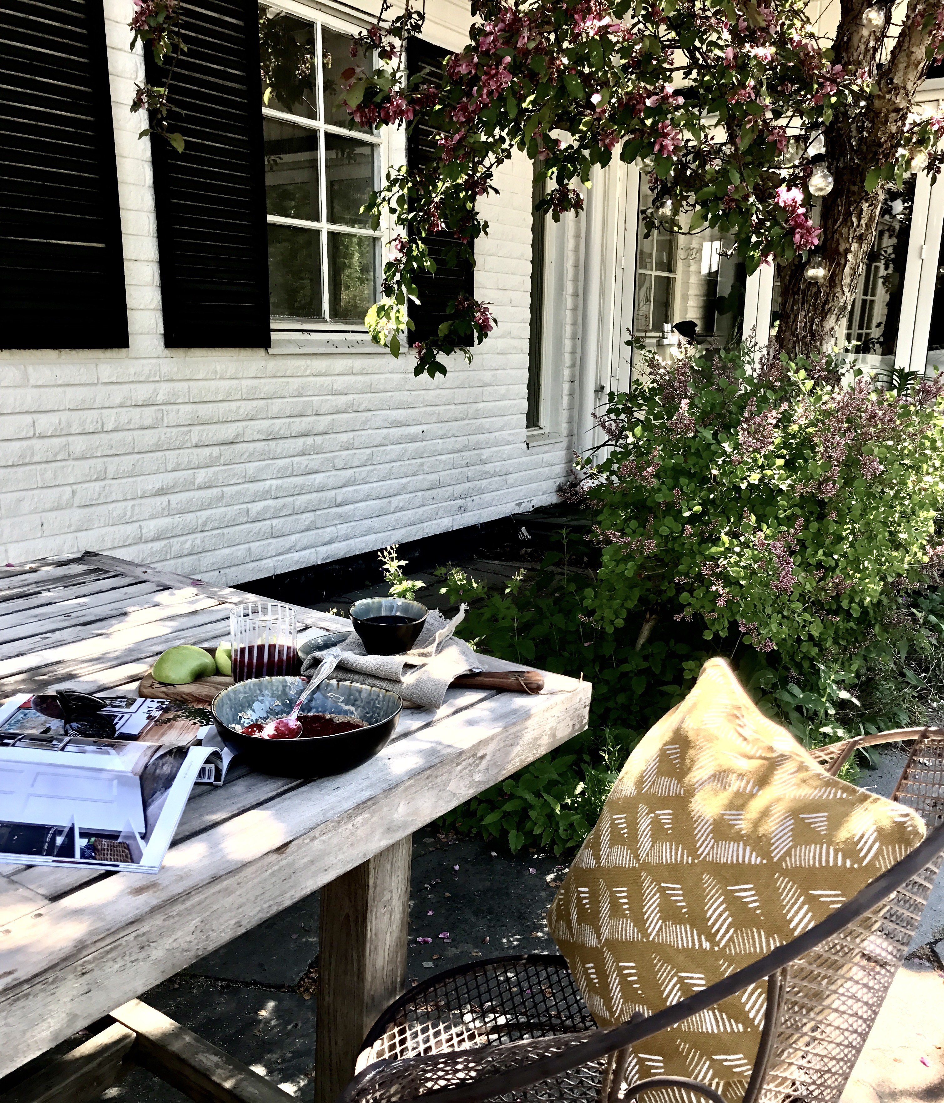 Jag har börjat morgonen med en riktigt skön sovmorgon sedan blev det frukost ute vid stora trädgårdsbordet i skuggan under apeln, helt underbart ,dagen kunde inte börja bättre.