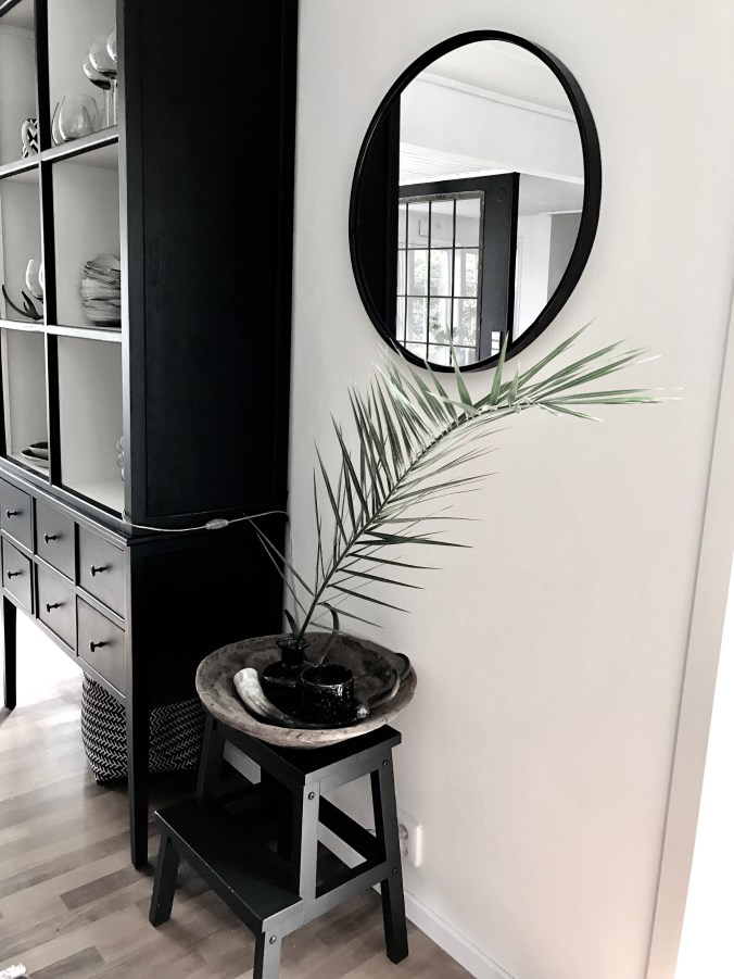Förra veckan när jag gick runt och skrotade här hemma och petade lite här och ändrade lite där såg jag att de svarta runda matbordet vid köket behövde bättras på i all hast snabbt som ögat och med en alldeles för liten pensel , 2 cm bred (hade inte tid att söka en större…)tog jag mej an det lilla projektet och när jag ändå var i farten så behövde den tråkiga pallen också få sej en omgång med svart färg.Färgen flöt inte ut som jag tänkt ,förmodligen för att jag använde en för liten pensel,så nu har jag slipat ner ojämnheterna lite lätt och målat om bordet igen ,med en lite större pensel den här gången.