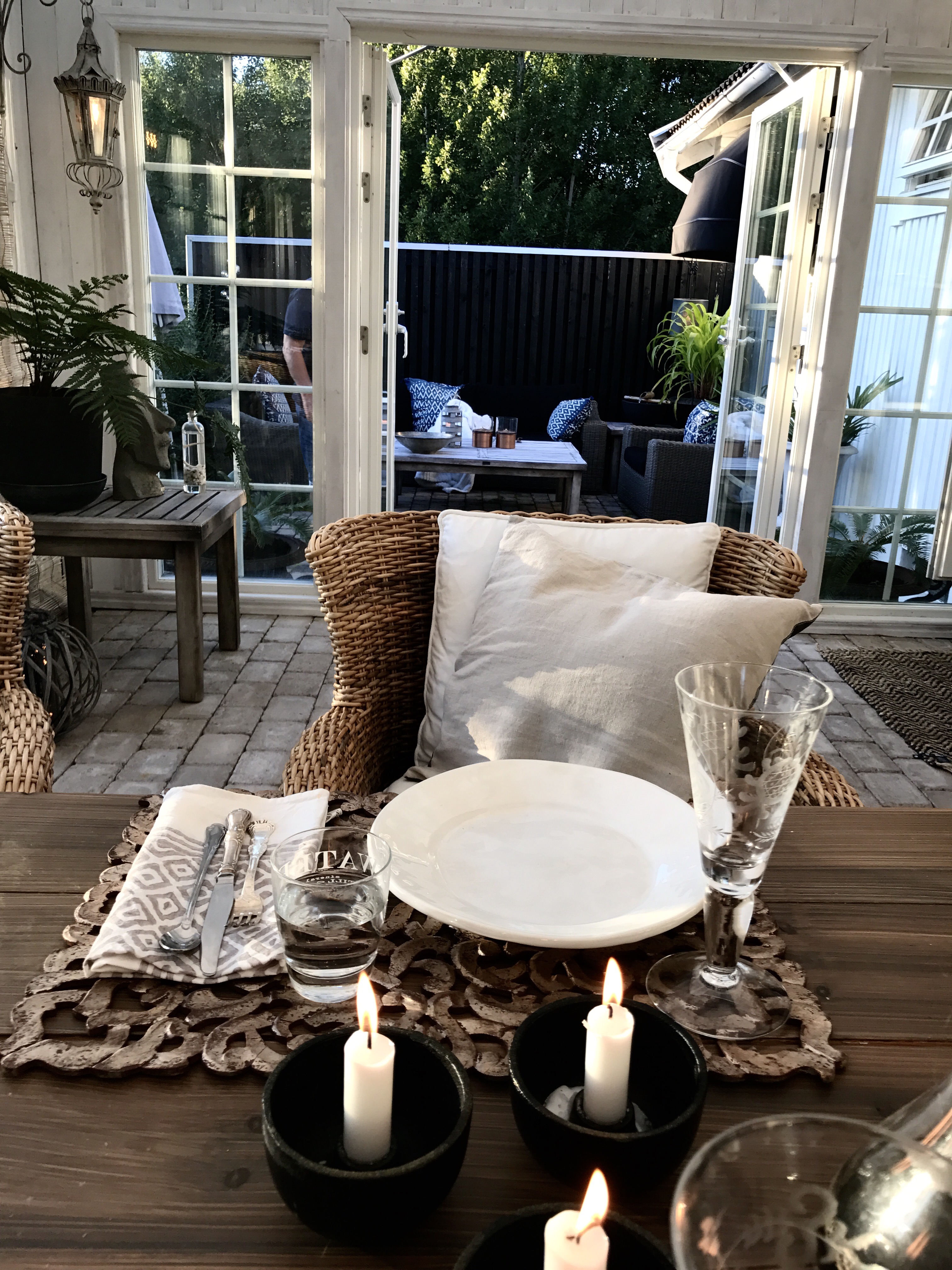 Vi fick en fantastiskt skön augustikväll vi satt länge och njöt av den fina kvällen i loungen och när skymningen kom tände vi några extra ljus och flyttade in till uterummet och fortsatte kvällen i ljuslågornas sken och med mörkret utanför , hur magiskt som helst.