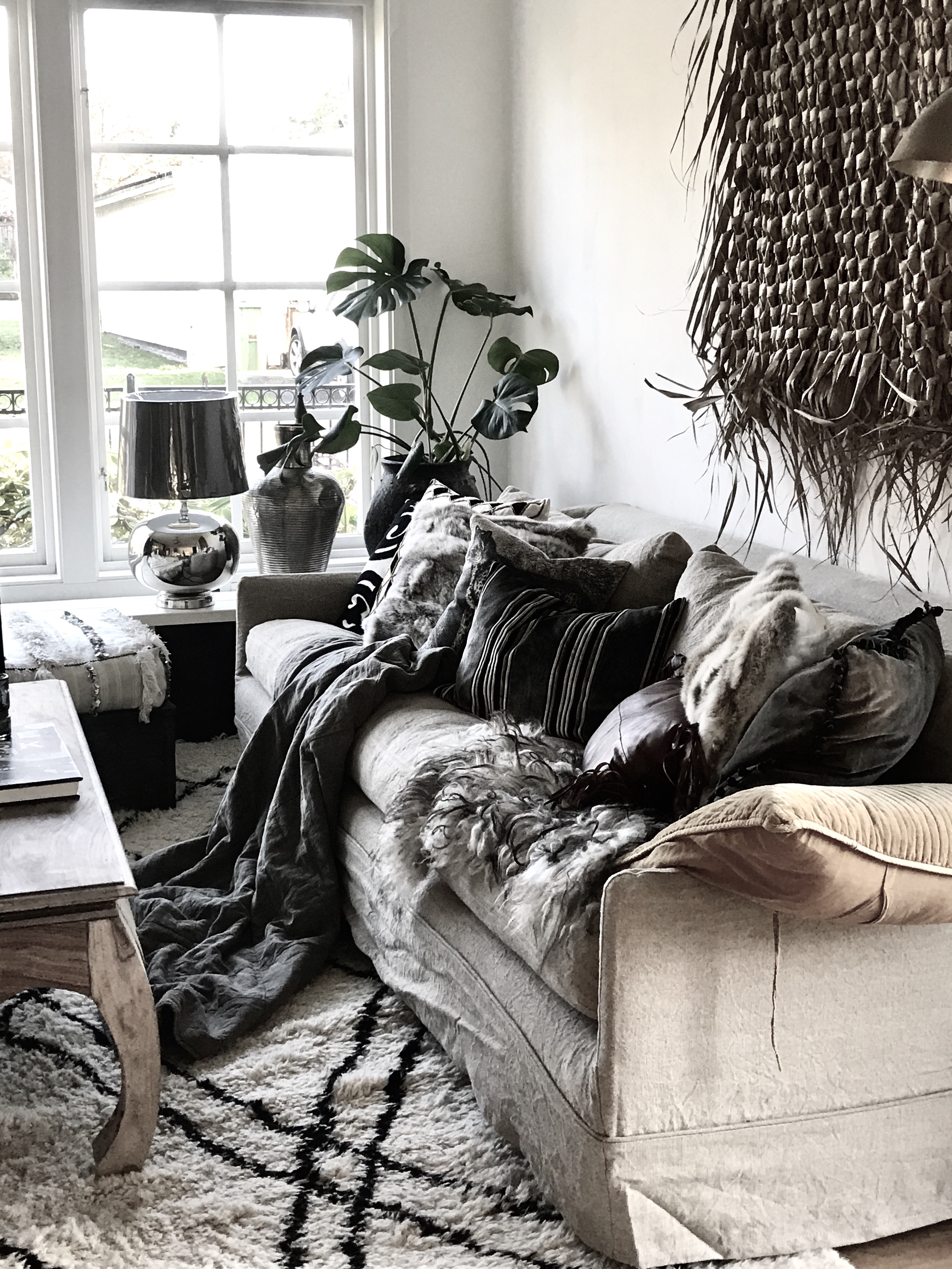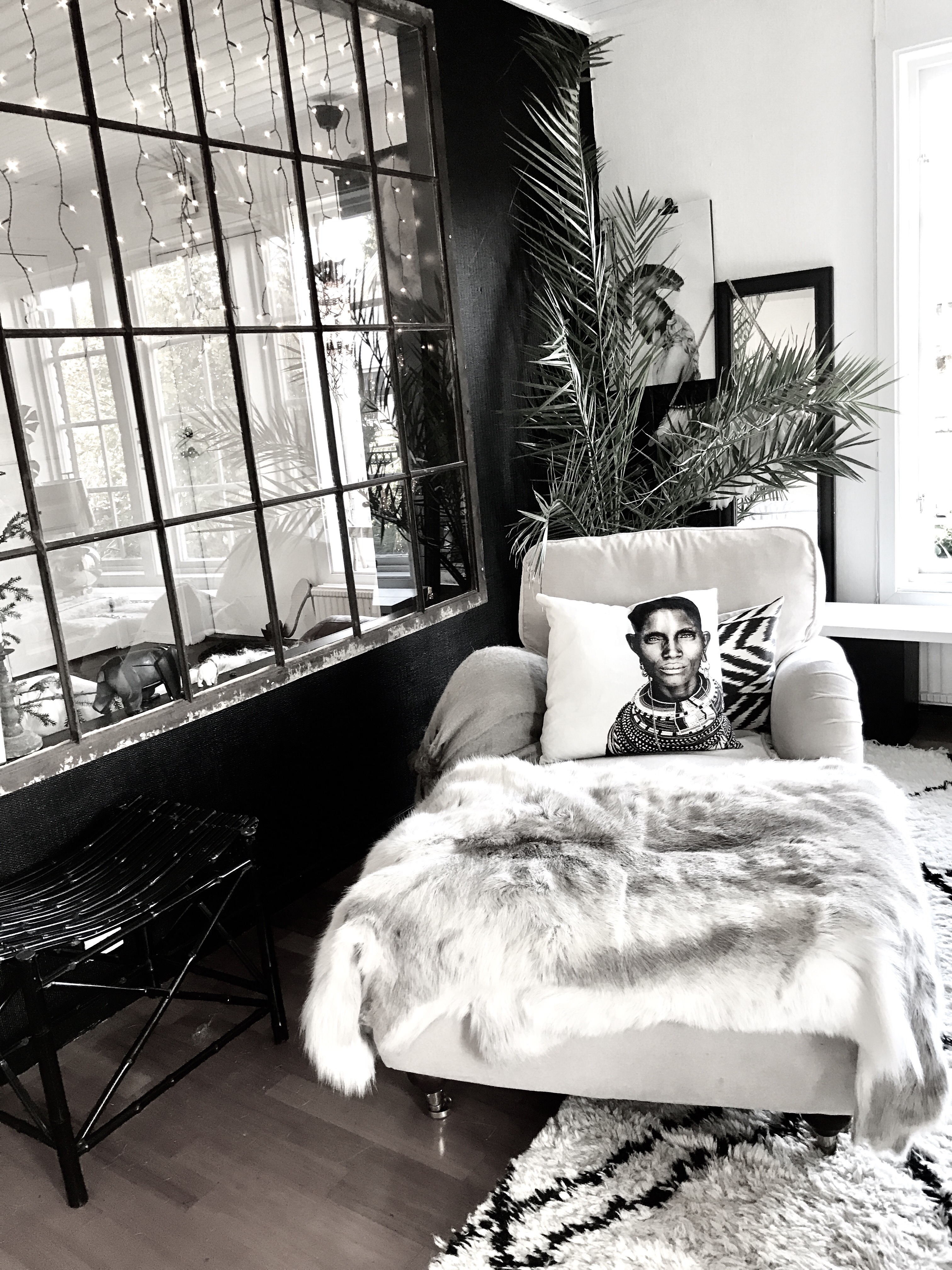 Jag bytte den grå pläden mot den mörkare lurviga som tidigare låg på schäslongerna i utbyggnaden bara det blev faktiskt fint med lite mer kontrast och struktur kanske kommer några färggladare sammetskuddar att bli fint.