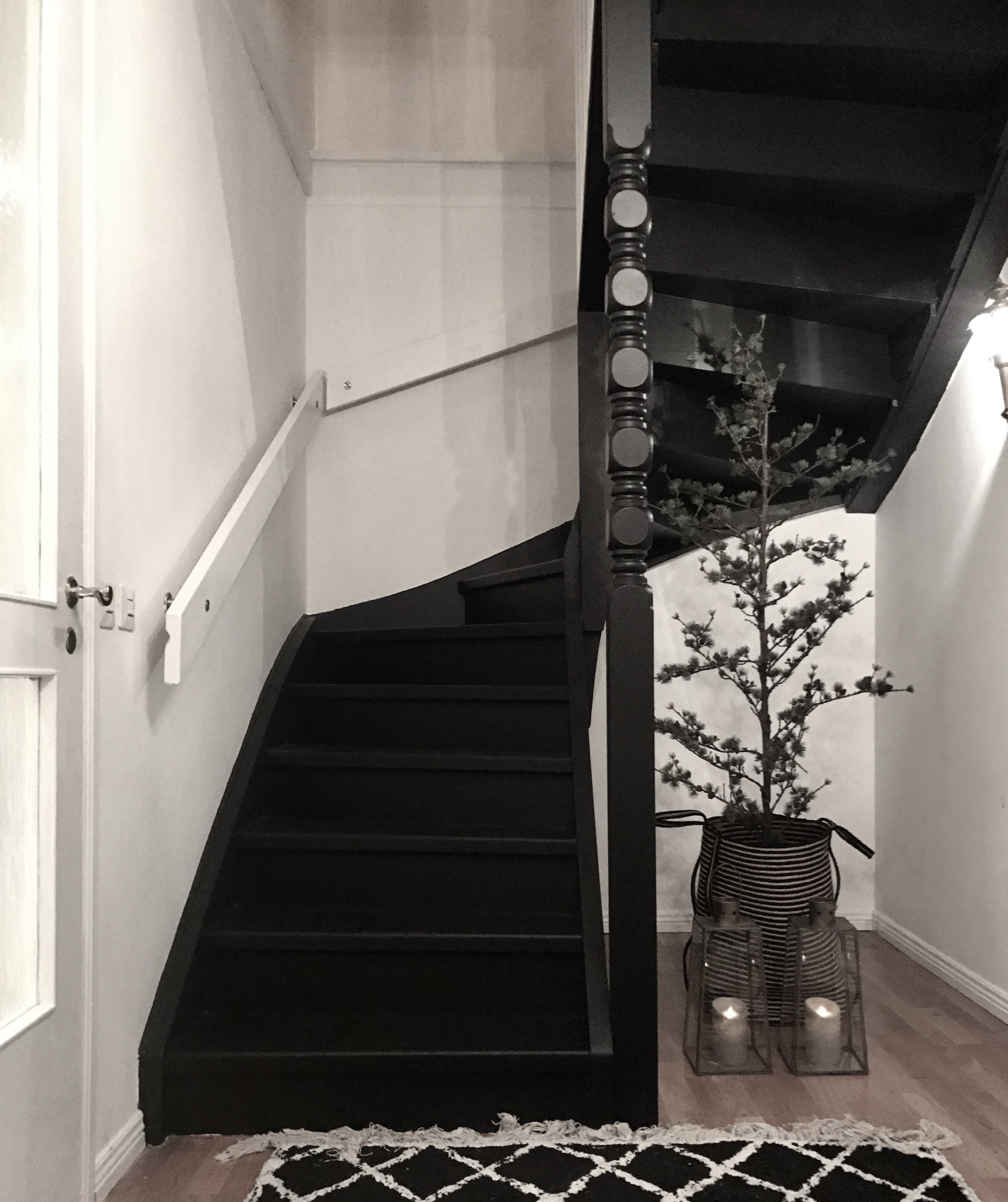 Som trappan som hon målade svart här i höst, bara så där, är så himla avis ,skulle också vilja ha en svart trappa, men jag har min hemska heltäckningsmatta som måste bort först och nya plansteg skall läggas på, men sedan…oj oj den dagen tror att både trappväggar och trapp kommer att bli svart hemma.