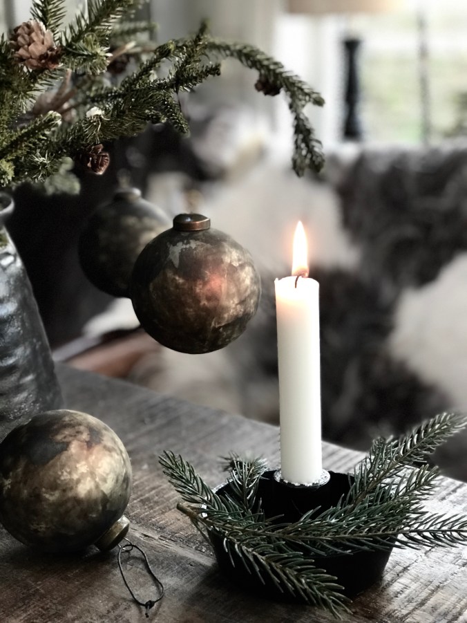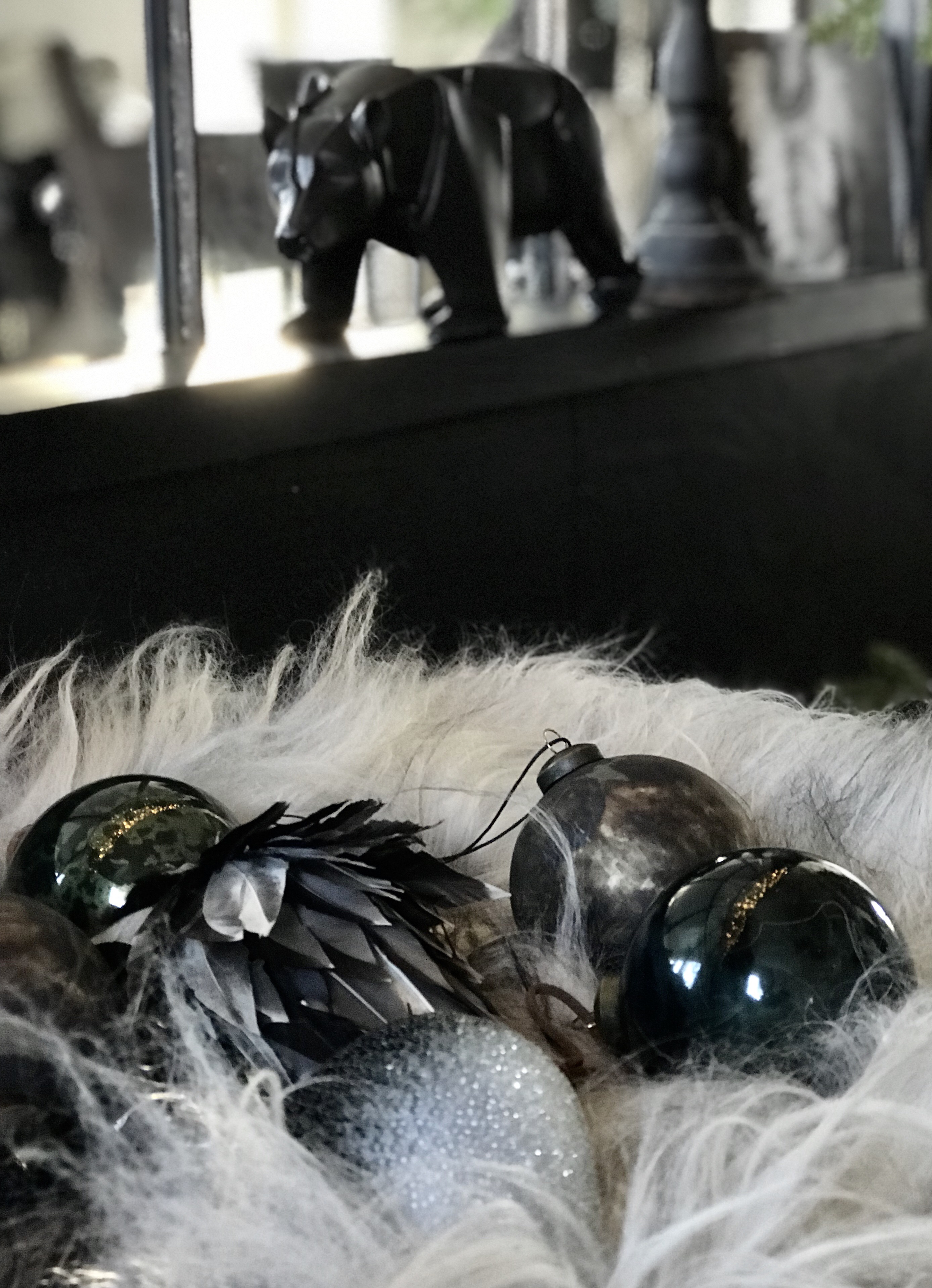 En annan är den lurviga bocken och de nya julkulorna, älskar julkulor och i år blir granen dov med smutsiga nyanser av blått, grönt,grått och guld . Kolla in de här matta glaskulorna med en metallisk rustik känsla .