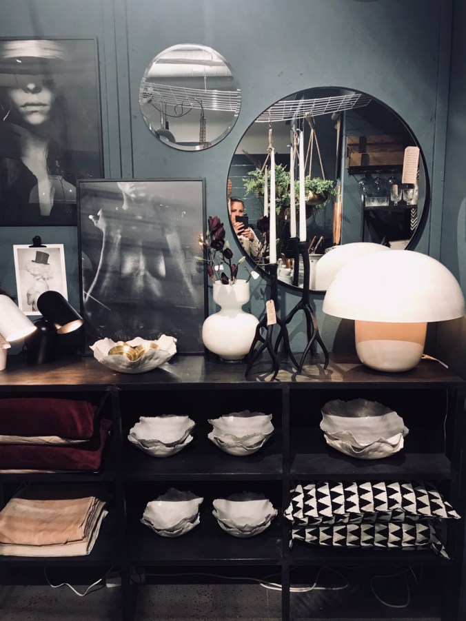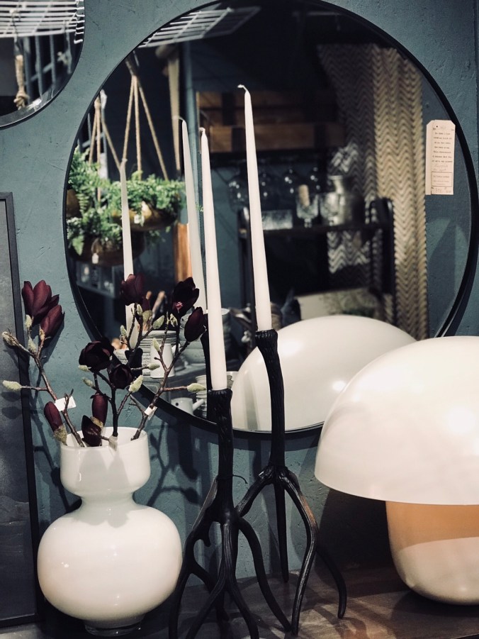 Och kolla in den här nymålade väggen och nu har hyllan framför blivit fylld med grymt snygga inredningsnyheter, lampan är en stor favorit.