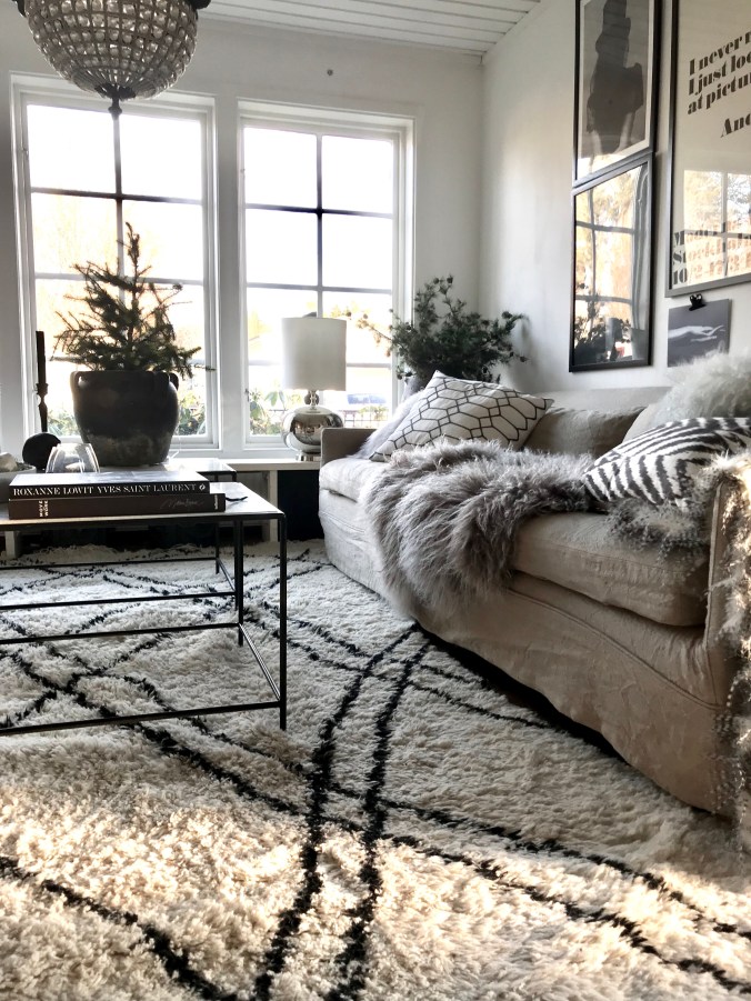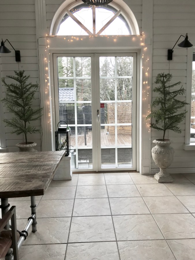 Men girlanger är upphängda,kvistar är nedstuckna i krukor,ljusslingor hänger både här och där och en och annan kula ligger på fat med kvistar.