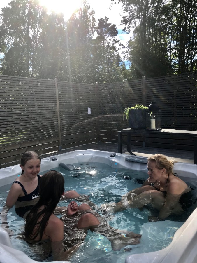 Anna ,Astrids mamma vann överlägset med flest rätt av de tio frågorna .Nu var det dags för ett dopp i spabadet .