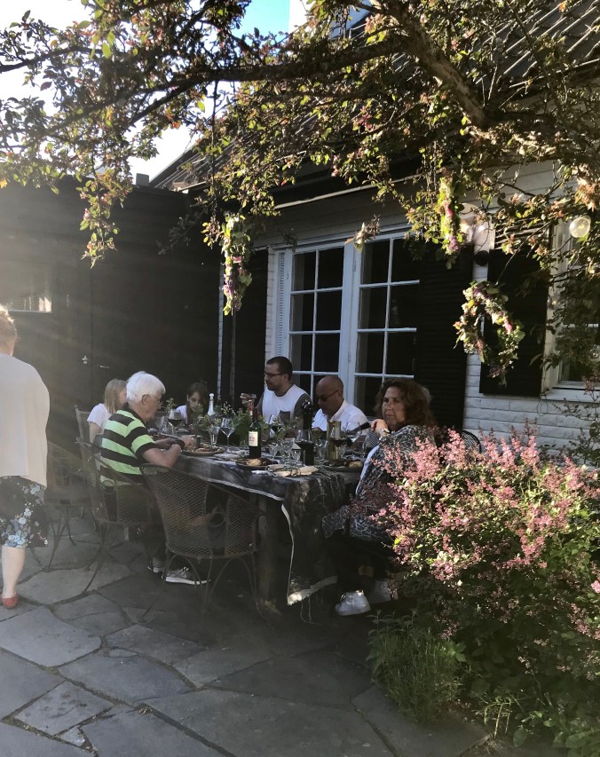 Vi började med lunch ute vid det stora trädgårdsbordet på uteplatsen .