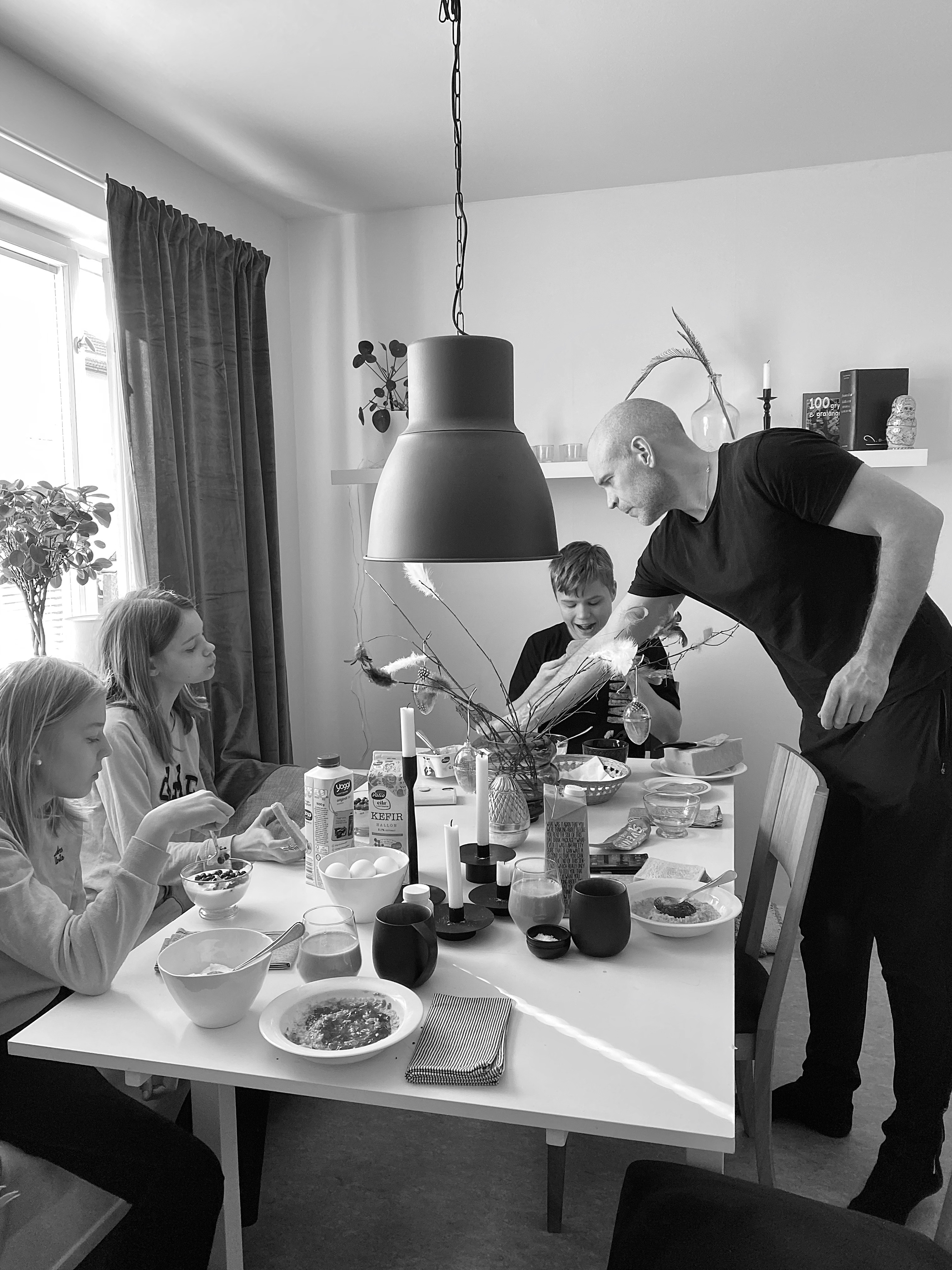 En tallrik havregrynsgröt, en stor proteindrink, ett glas hallonkefir och en mugg hett svart kaffe.
