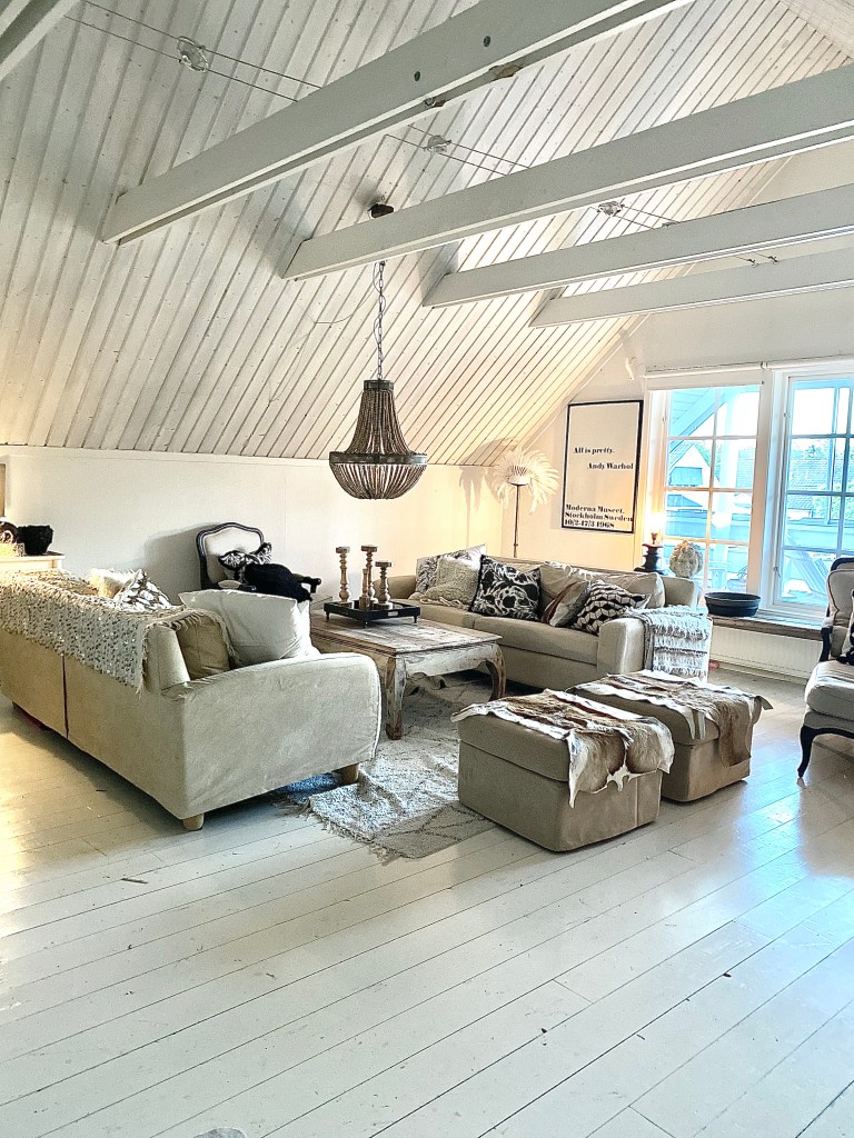 Jag har en jättemysig övervåning . När vi köpte huset så var här en lila heltäckningsmatta,bjälkarna var mörkbruna,taket furu med ett tunt lager ljus lasyr och väggarna tapetserade med mörk väv.