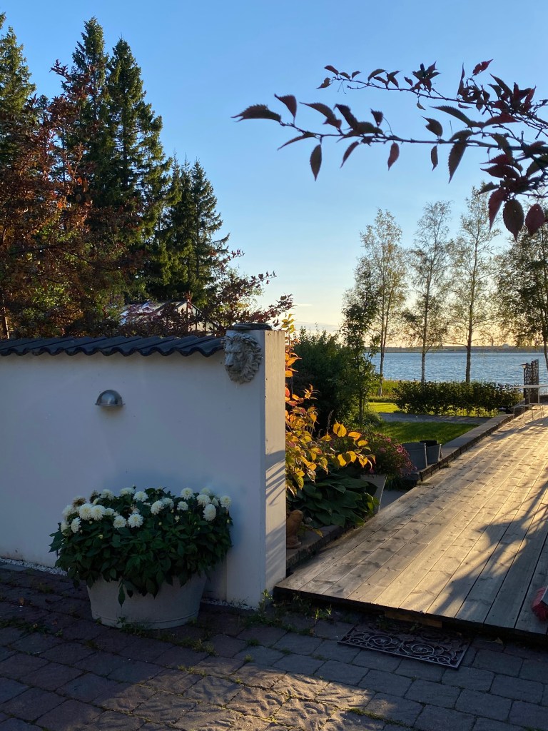 Middagen avnjöts i hennes rymliga men ändå mysiga uterum. Det serverades lax gratinerad med västerbottensost och kokt potatis, galet gott.