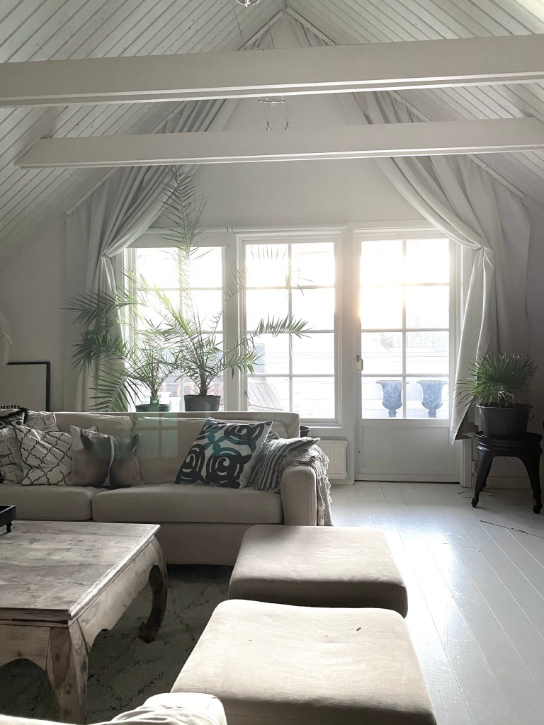 Det stora rummet på övervåningen,med takhöjd till nock har blivit filmrum . De två stora fönstren och balkongdörren,som annars är något av det bästa i rummet behövde kunna täckas över så att rummet blir så där kolsvart och perfekt när man ska se på film.
