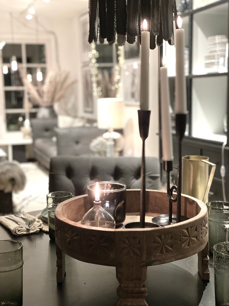 Det nya lilla snidade träbordet från butiken är min nya inredningsfavorit . Den är egentligen som en bricka på ben, nu har den fått flytta runt i huset .