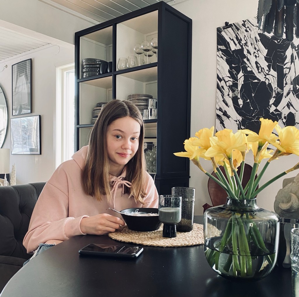 Jag och Vilma har haft en mysig liten stund vid frukosten tillsammans den här morgonen. Snart ska jag ska åka till butiken och cafet och Vilma ska cykla till skolan.