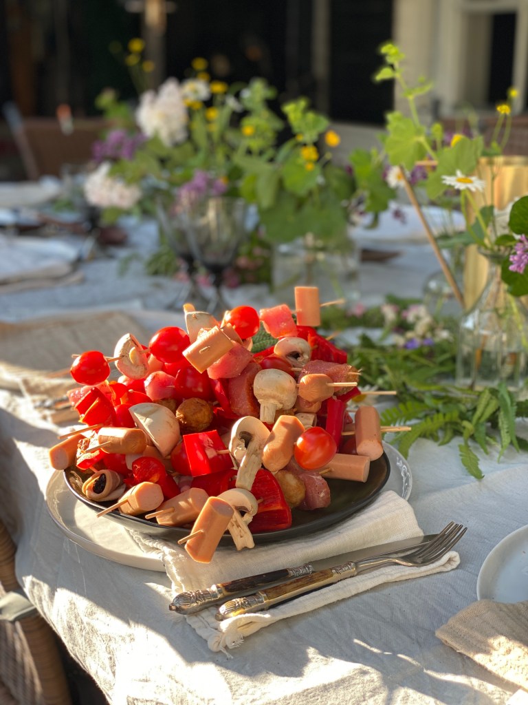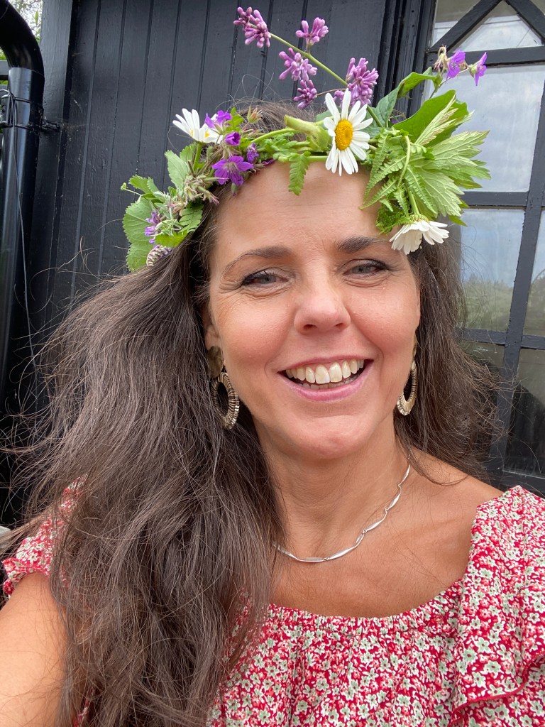Det stora trädgårdsbordet under apeln är dukat i midsommarskrud. Hinkar fyllda med ängsblommor står klara att bli till kransar till våra huvuden.