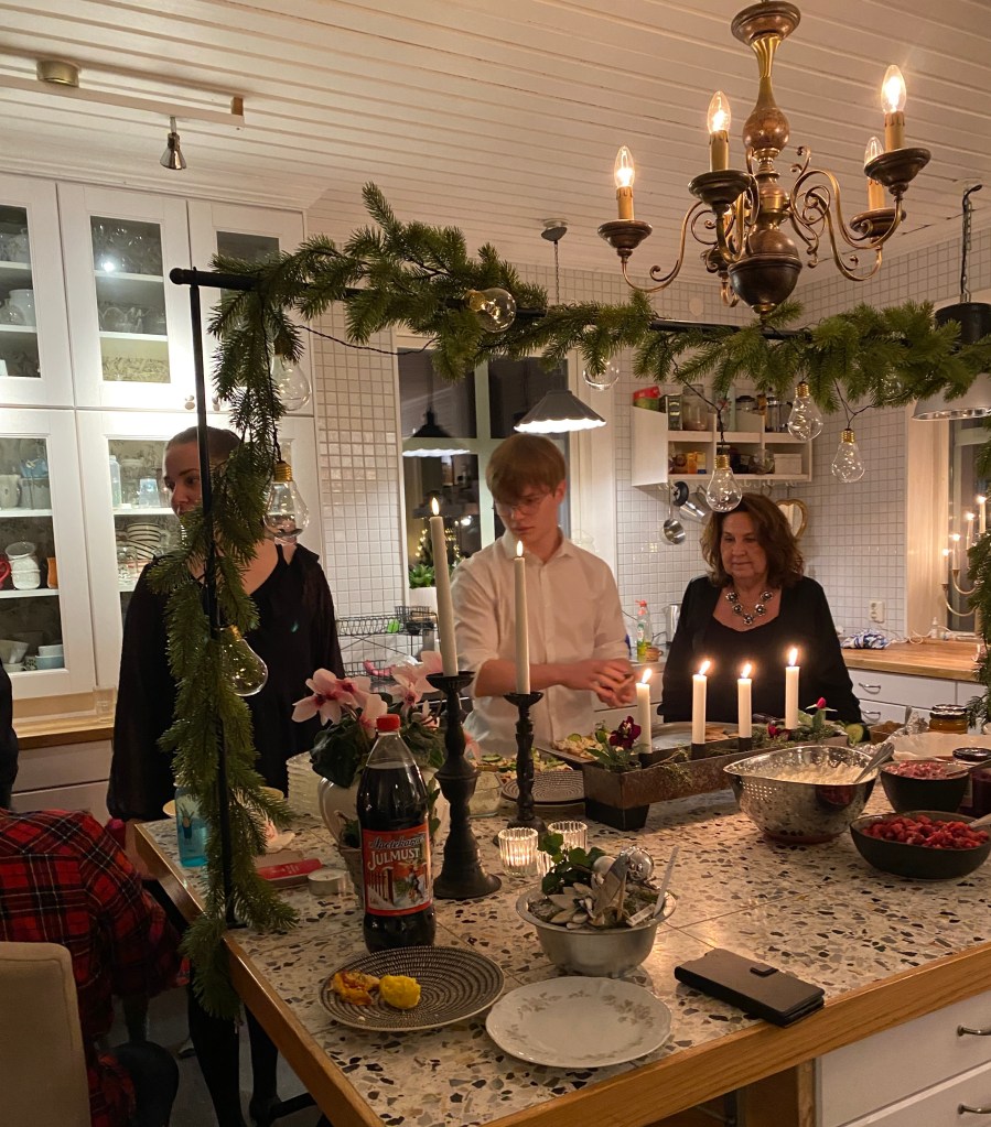 Maten för dagen bestod av snittar som tilltugg till glöggen. Till varmrätt blev det lax med romsås alternativt köttbullar med kokt potais och gräddsås.