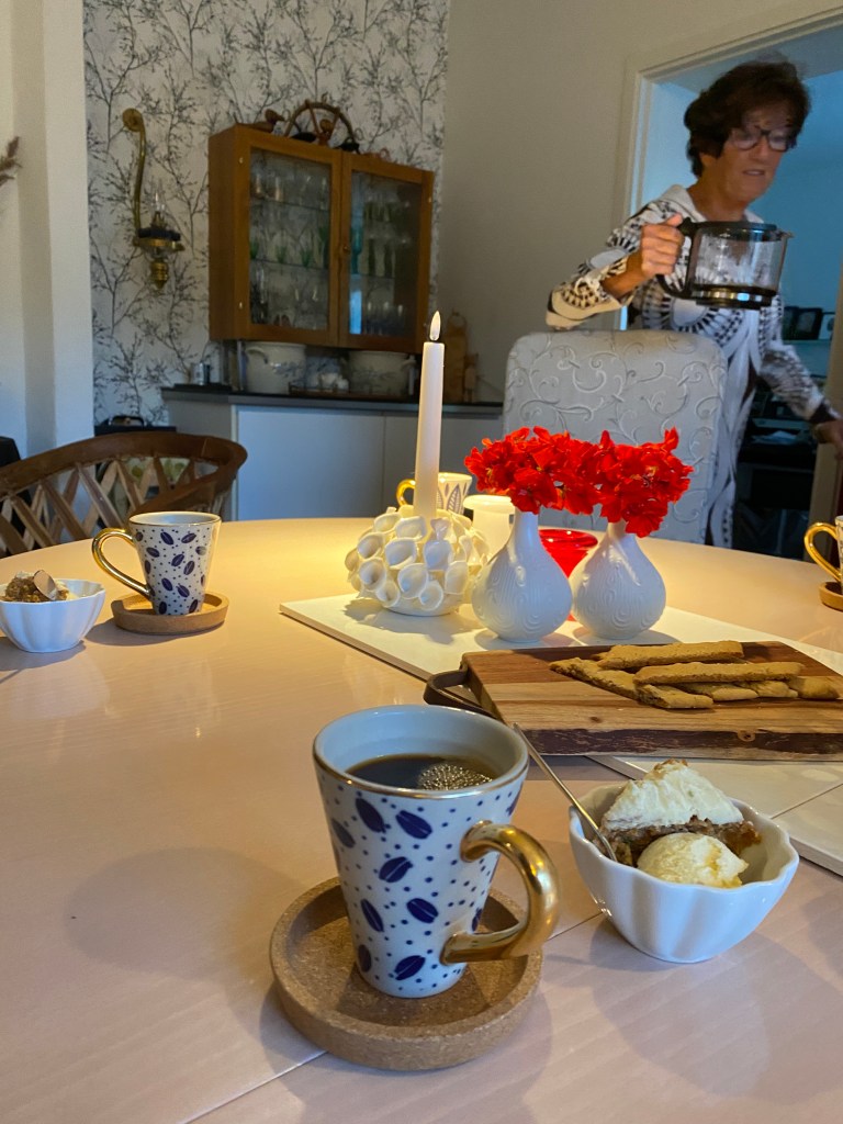 I går i kvällssolens sken åkte jag och Daniel hem till gulliga Asta och Sven . Vi lämnade in Daniels smokingbyxor som behövde kortas en aning. Asta är inte bara sömmerska utan är också en hejare på att baka . Vi har varit vänner sedan många år och dom kommer att vara med under vår stora dag. Det blev en fin stund med prat om bröllopet förstås.