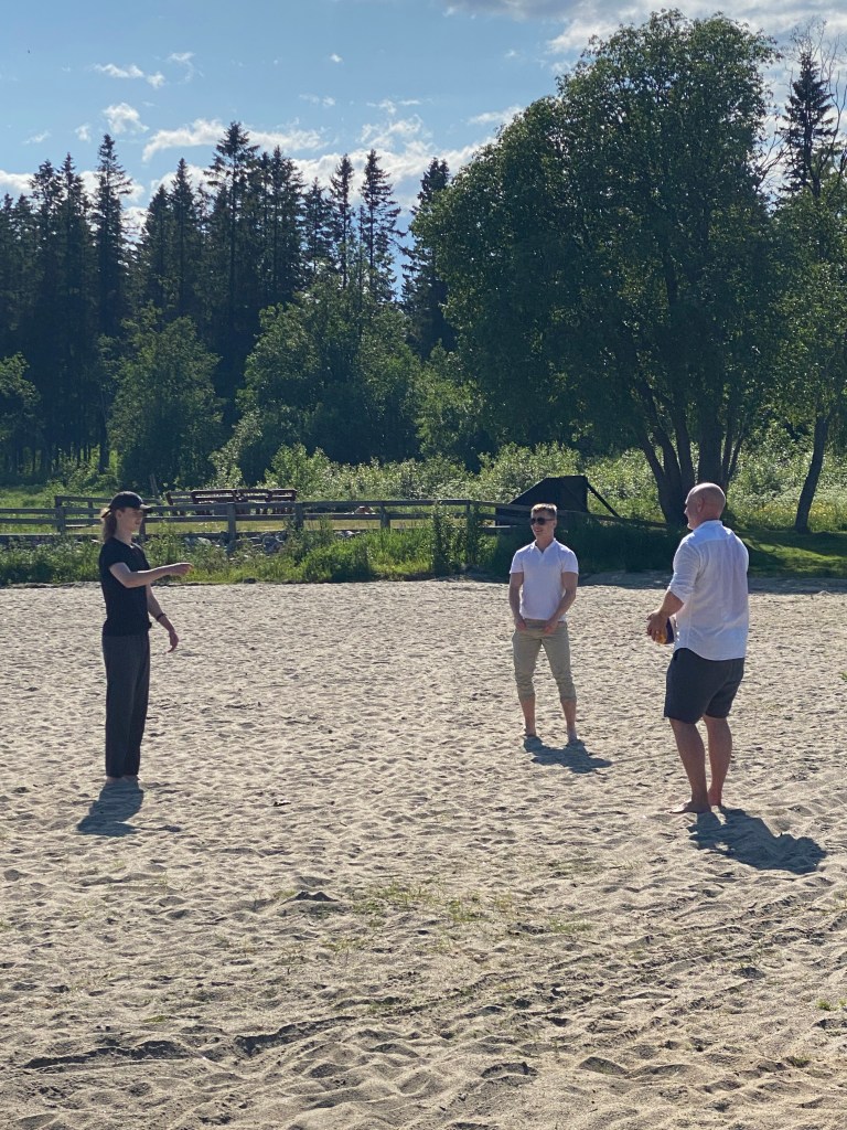 När vårt lag förlorat (?!)den första tävlingen promenerade vi alla ner till havet. Här skulle de ätas baconlindade dadlar, jordgubbar och brieost med fikonmarmelad. Vi tävlade ytterligare två grenar i midsommarkampen och en stund av fartig beachvolleyboll.