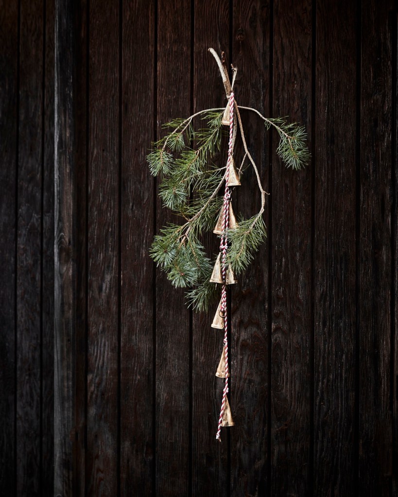 Den röd-vitrandiga girlangen med klockor av antik mässing är fin i både granen och på en krans eller varför inte på en kvist i all enkelhet.