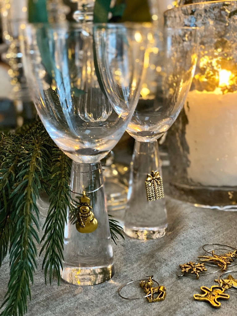Det blir dova tallrikar och band runt tygservetter. Markörer till glasen är både praktiskt och blir en rolig snackis .