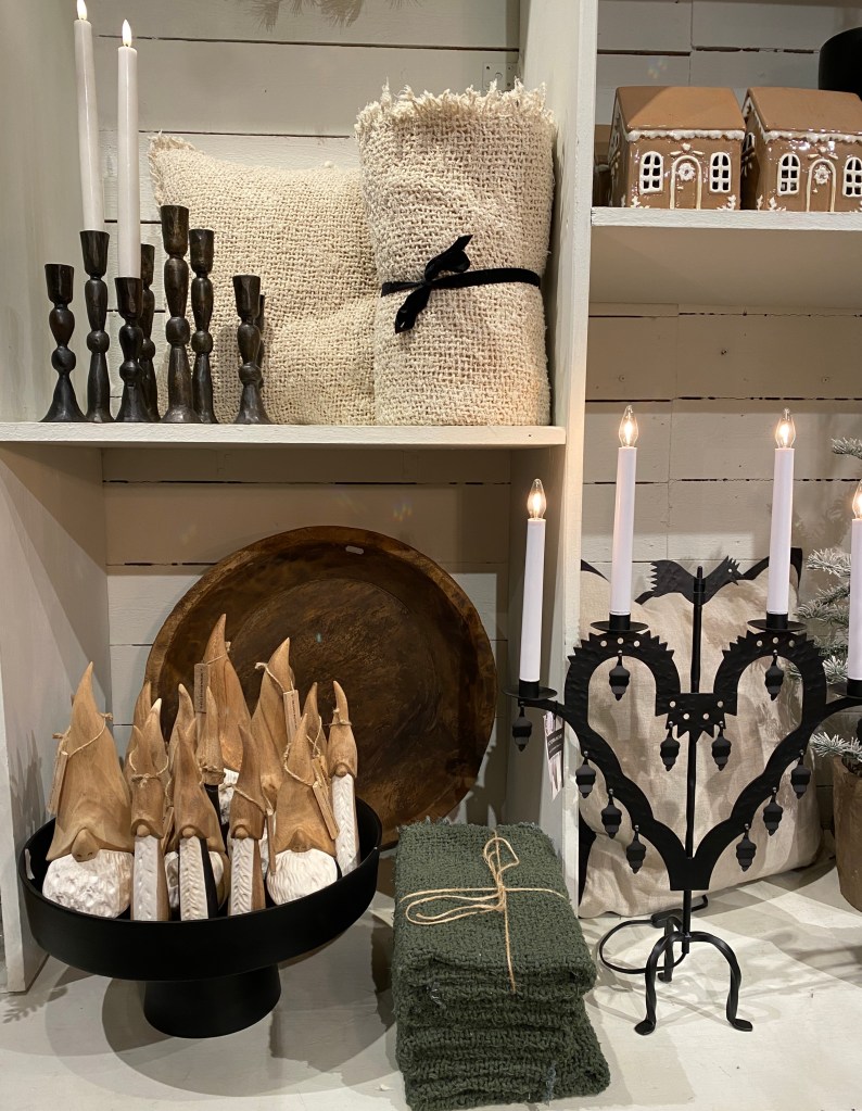 Välkommen in i butiken också. Här har vi fyllt upp med stilsäkra fat på fot . Gosiga kuddar , plädar och pepparkakshus av keramik .