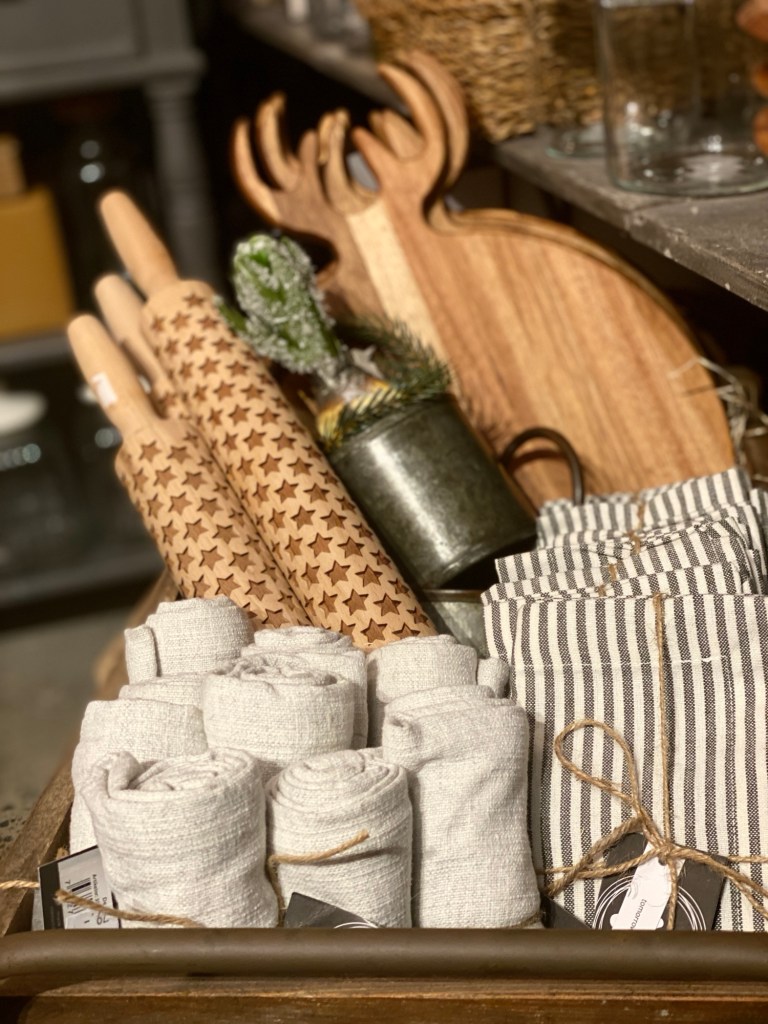 I butikens skafferi har vi så många fina julklappstips . Kökshanddukar, kavlar, skärbrädor , unika gamla burkar till redskap eller vad man önskar och riktigt härliga rustika trälådor.
