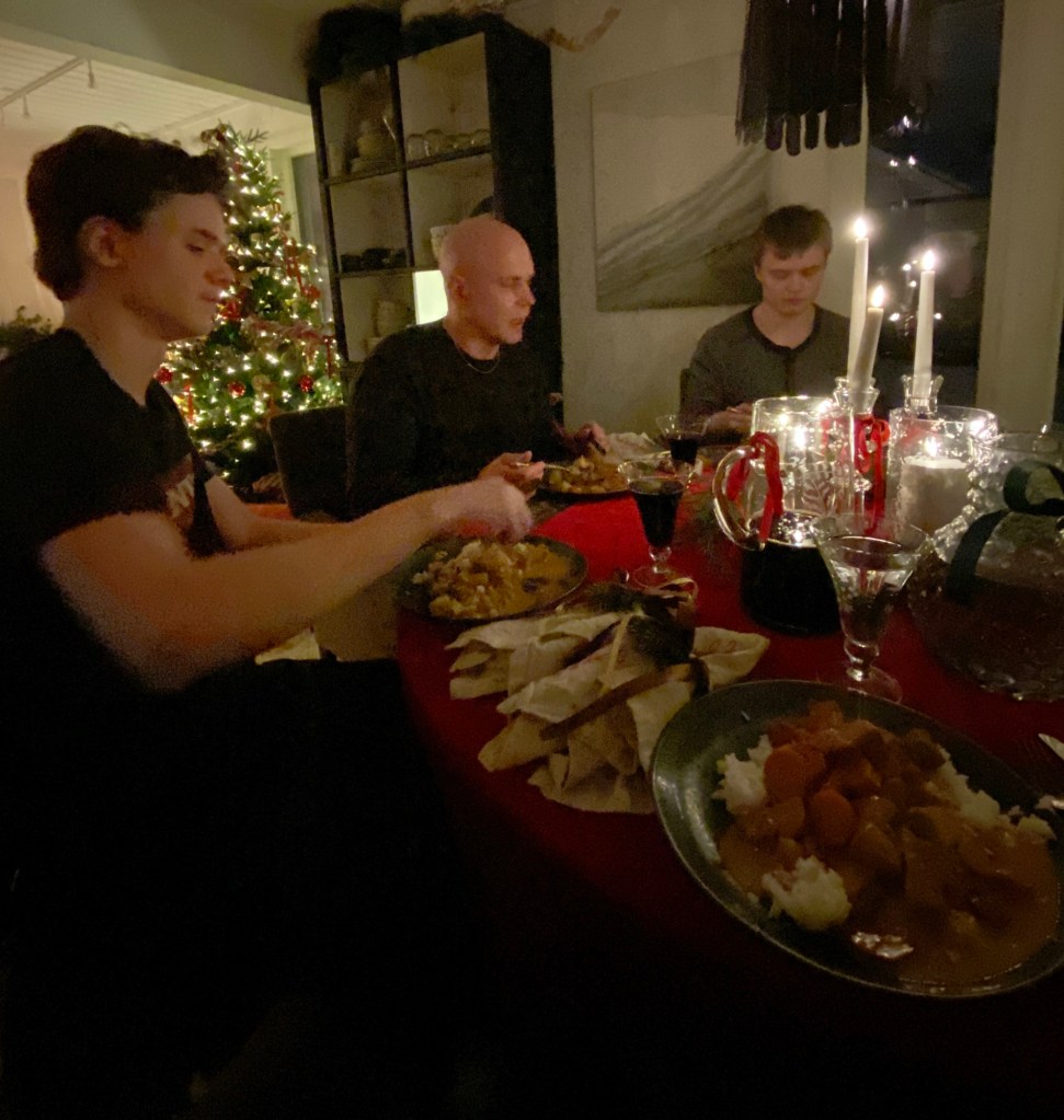 I kväll ska vi fira julafton med vår lilla bonusfamilj . Vi ska börja kvällen med att sitta runt det runda bordet och äta .
