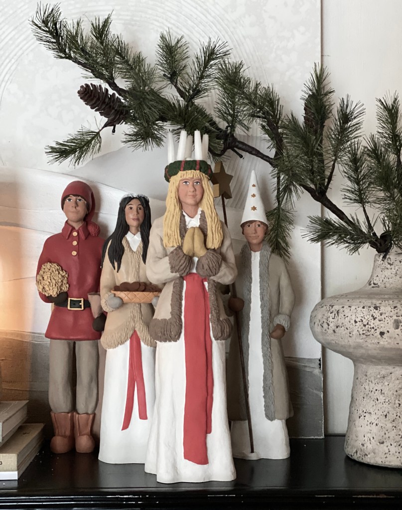 Jag har tagit fram mitt luciatÄg . Det har blivit en kÀr tradition för mej.Det Àr sÄ stÀmningsfullt att mötas av det dÀr pÄ skÄpet i hallen.varje dag nÀr jag kommer hem.