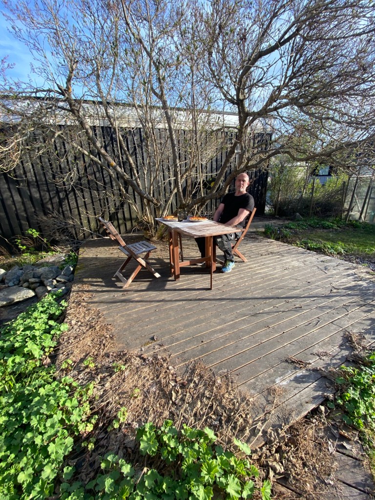 Någon kvart senare är pizzorna klara . Vi tar med dom ut och äter dom med några stora glas bubbelvatten under syrenen i den överväxta trädgården .