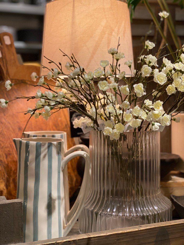 Jag har tagit mej en runda i trädgården och njutit av allt som blommar . Den här nya låga krukan är en favorit .Jag plockar in några kvistar och blommor från planteringarna .