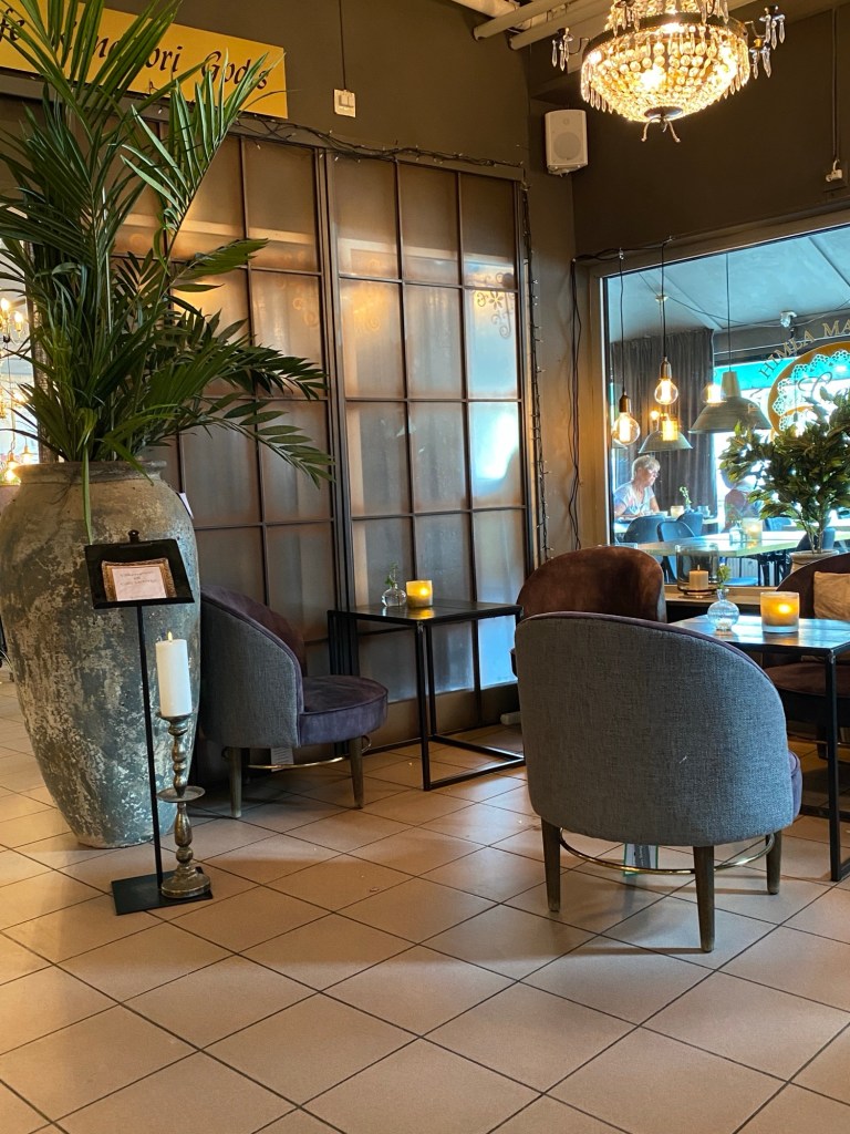 Jag plockar alltid med mej några kvistar kryddor och blommor från min trädgård till butiken och cafeet.