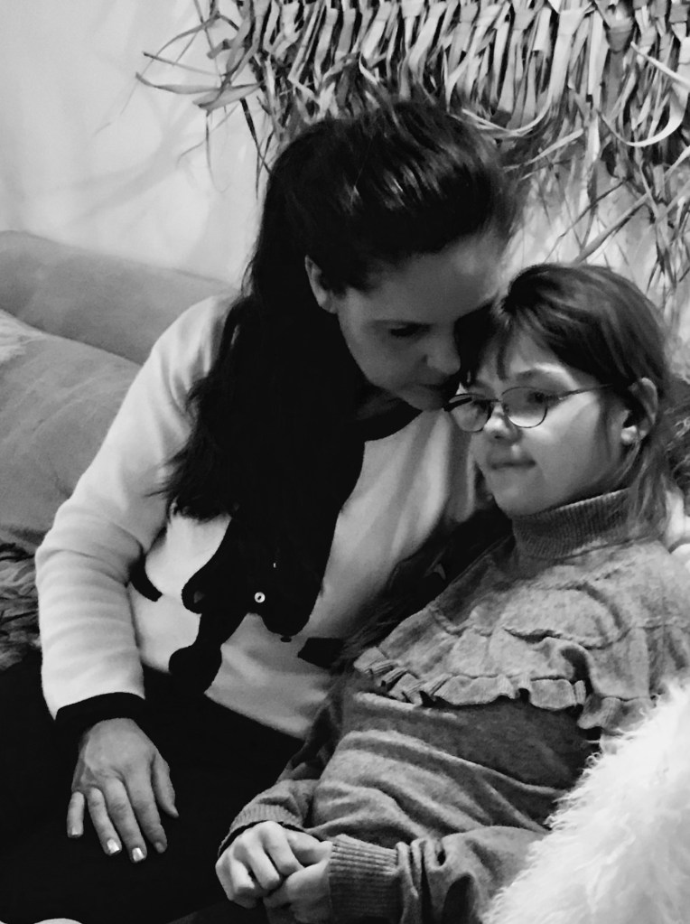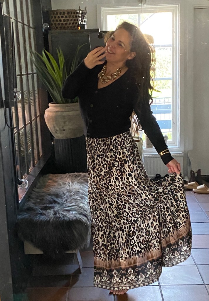 En kjol med stretch och en stickad grå tröja med en fin rosdetalj