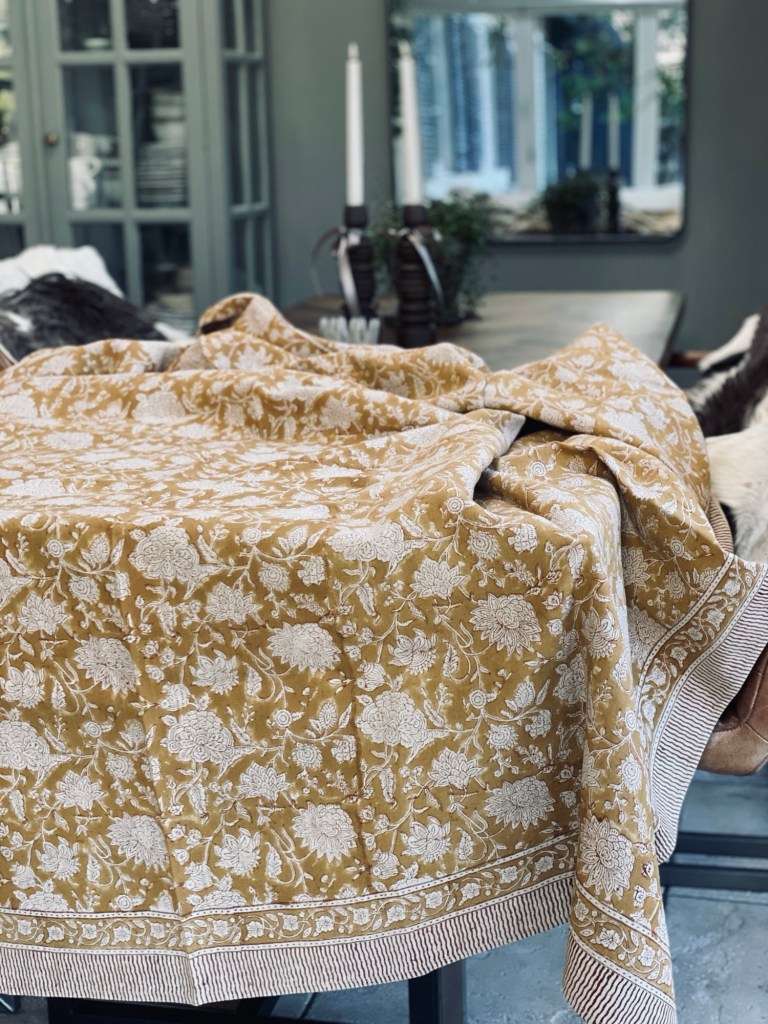 Den här träbänken med den bredrandiga duken och kudden gillar jag.