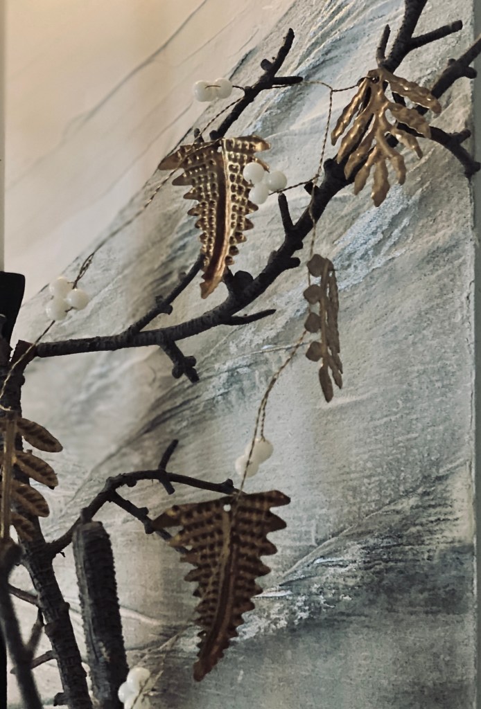 På en gren som står i en vas på skåpet i hallen hemma har jag lindat den här girlangen av mässing med små arbetade blad och vita pärlor.