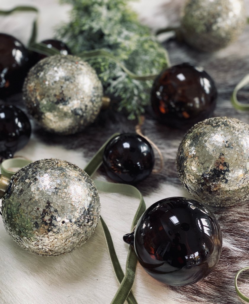 Jag har redan valt ut några ljuvliga julfavoriter. Älskar julkulor och fina band. Gillar kontrasten mellan de här bruna blanka glaskulorna med fint hänge mot de glittriga silverkulorna.