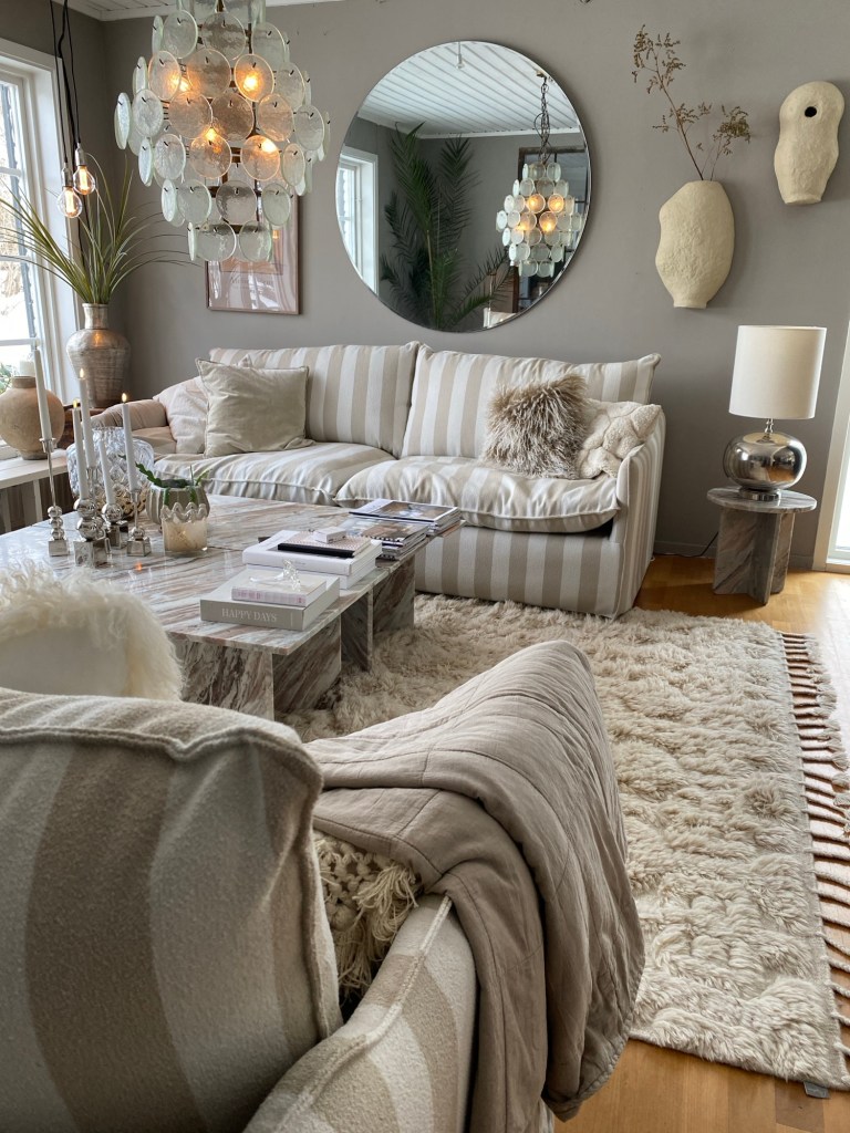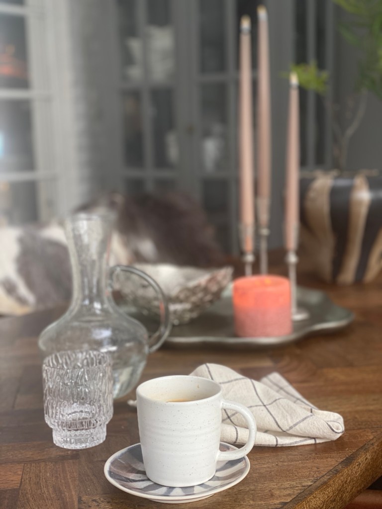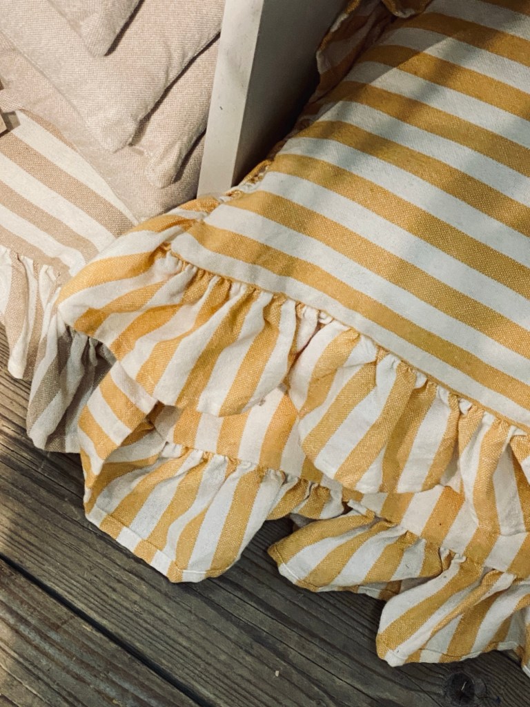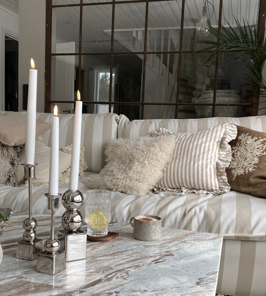 Gosiga dukar med volanger i flera mysiga färger packades oxå upp. I beige och svart och samma fina rand även i löpare.
