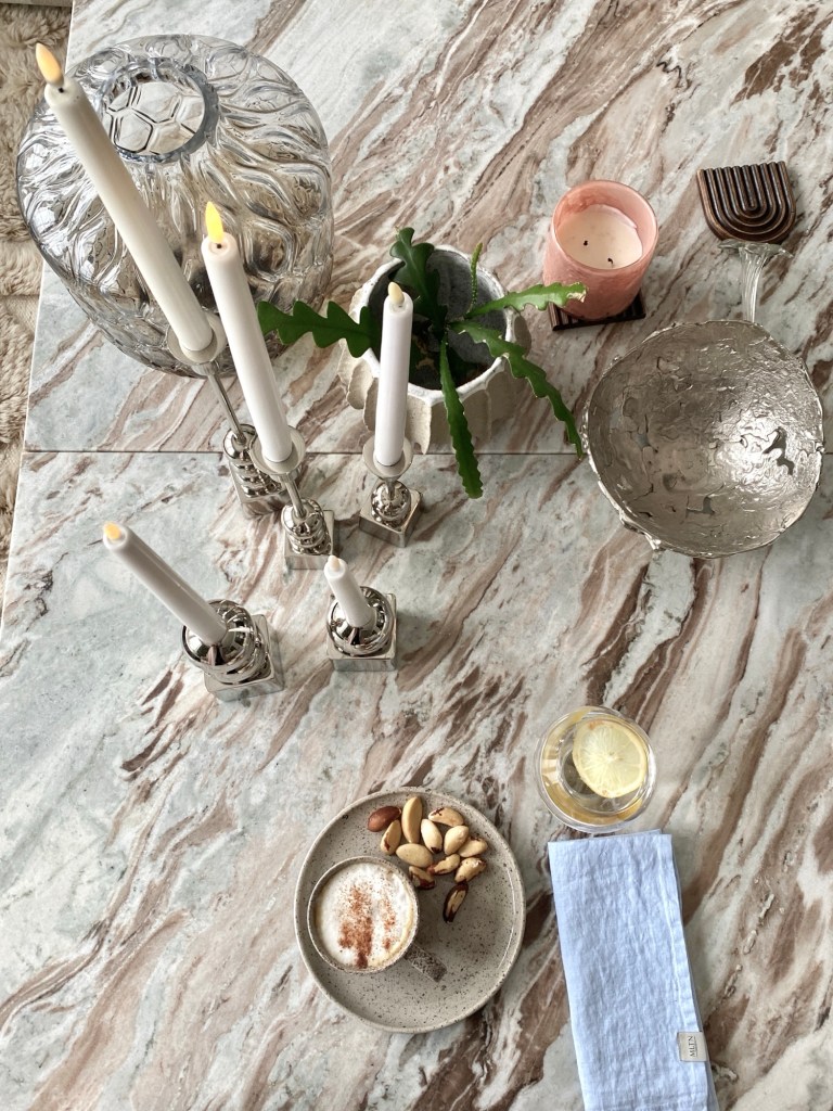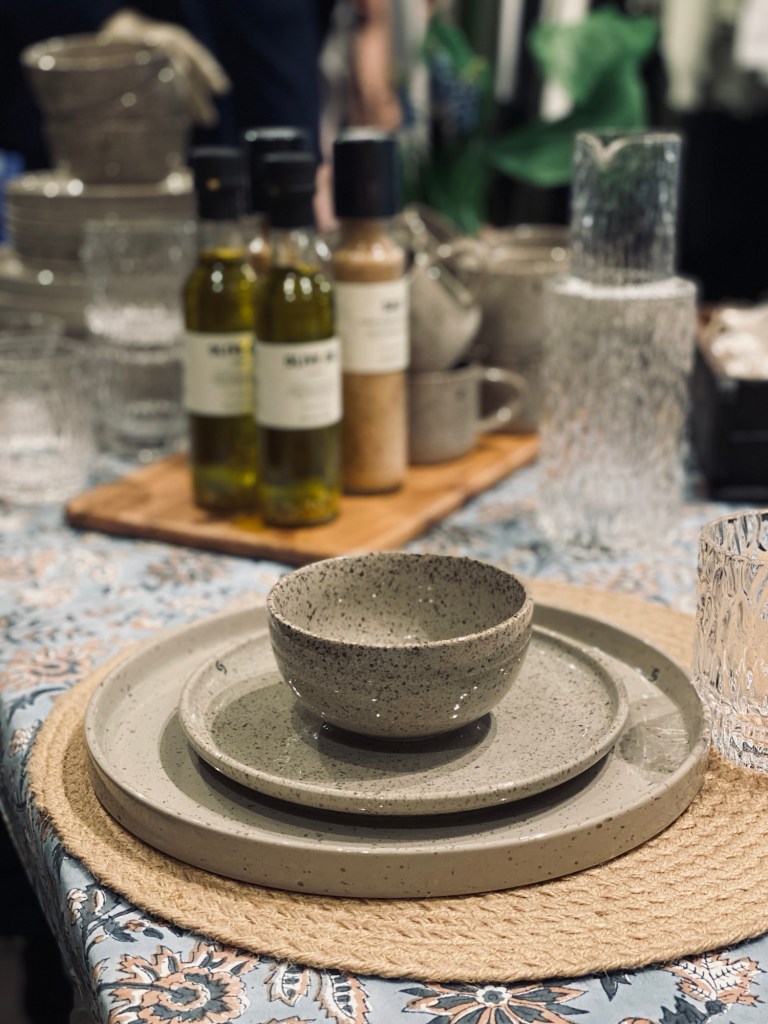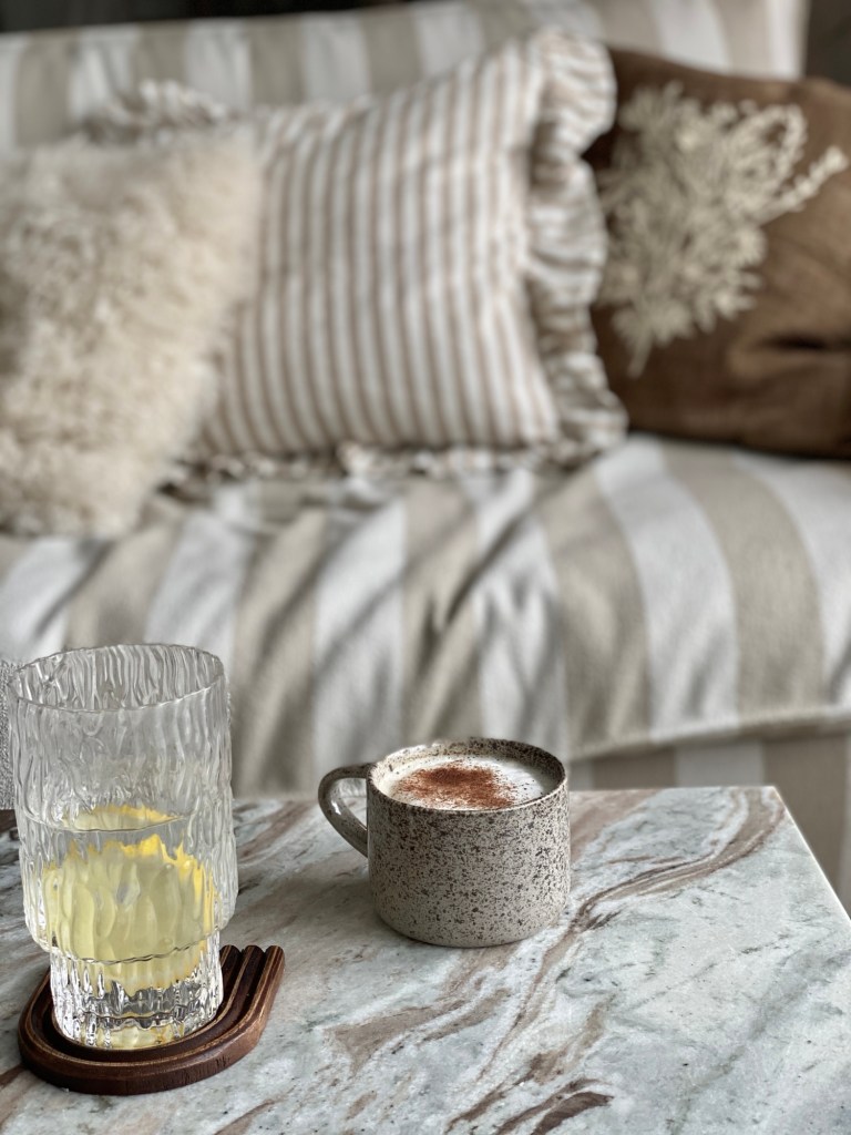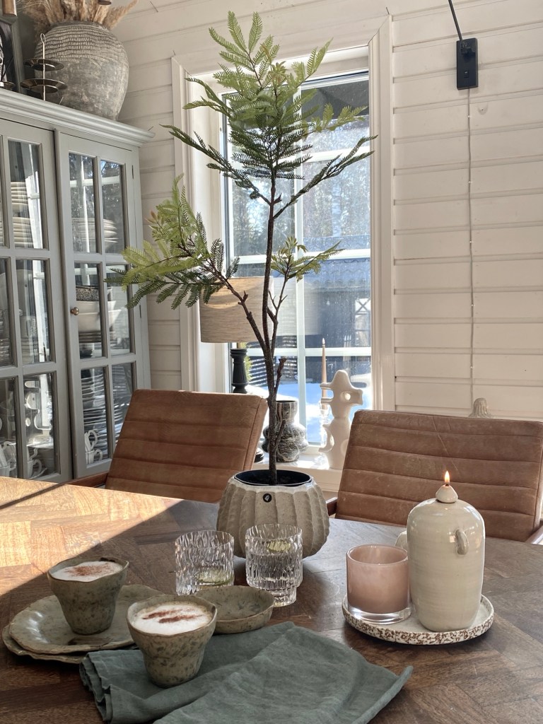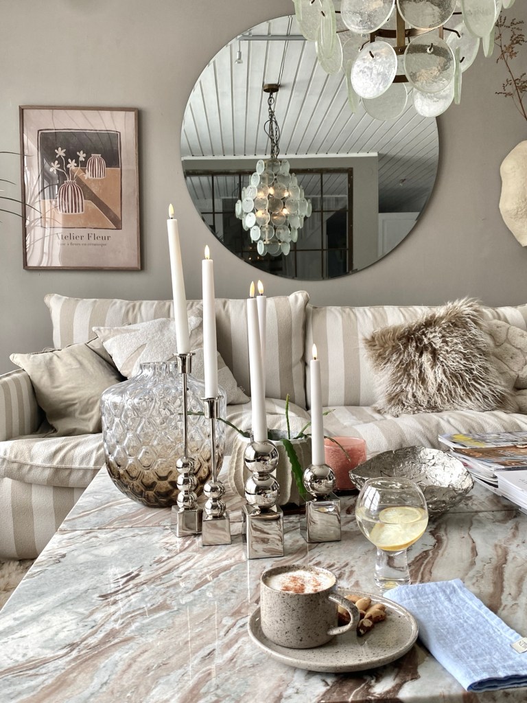 Gosiga dukar med volanger i flera mysiga färger packades oxå upp. I beige och svart och samma fina rand även i löpare.