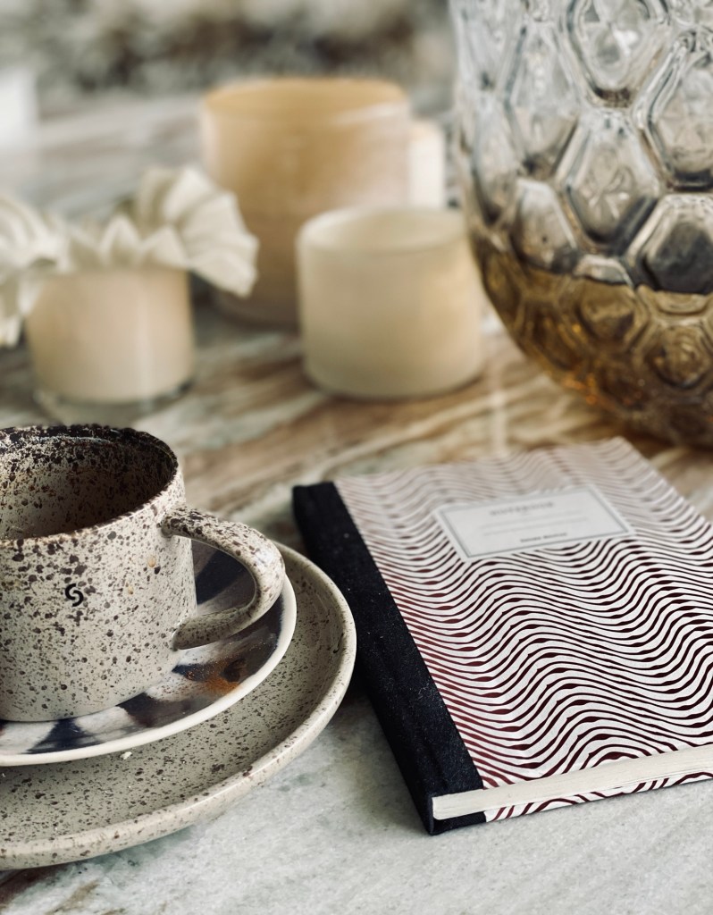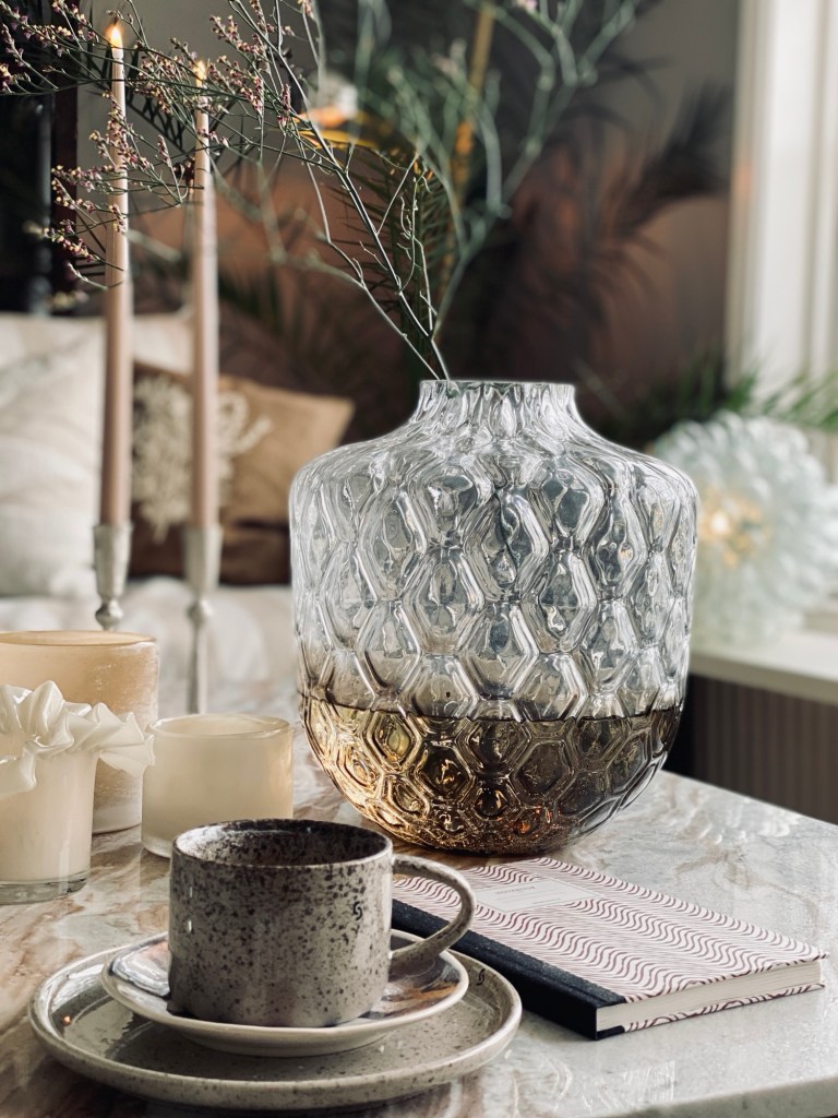 Den här ljusa lätta känslan som jag gillar att kombinerar med gosiga kuddar med mjuka mönster. Även stenmaterial som i det här fallet är marmor och det mönstrade glaset i den maffiga favoritvasen .