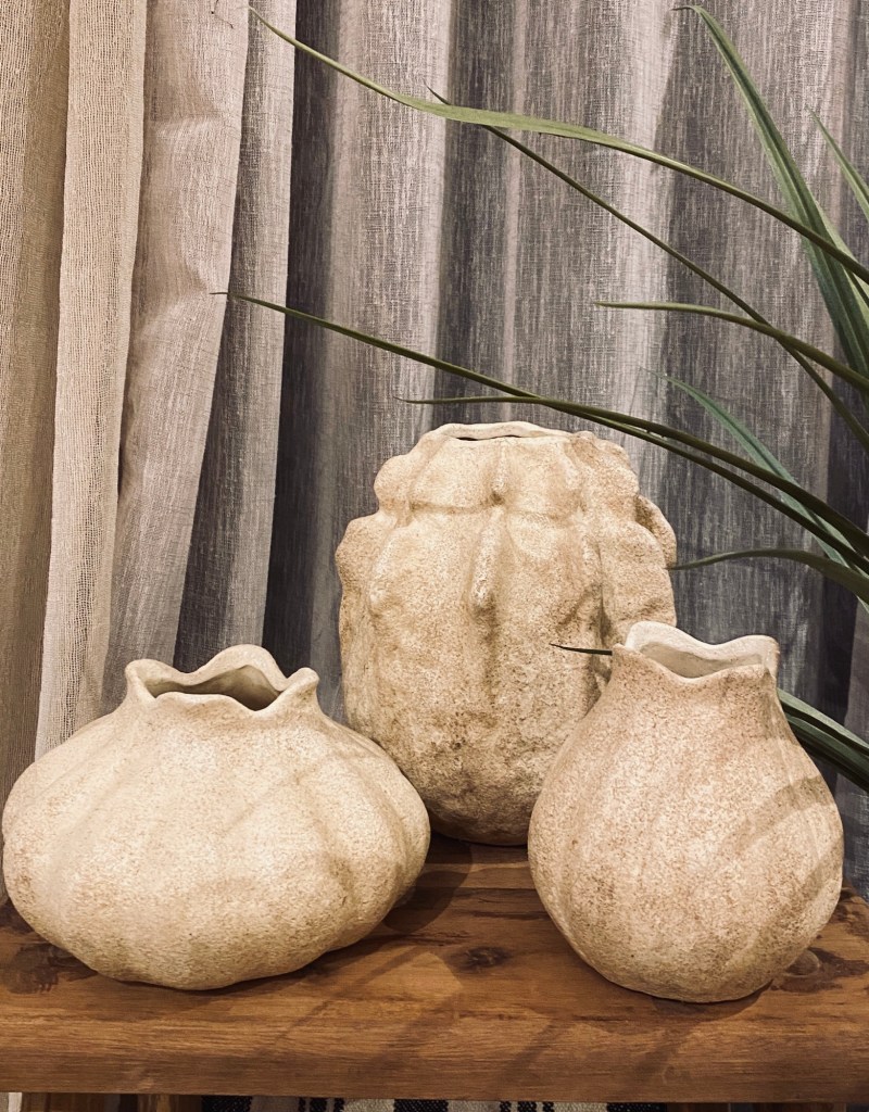 I Victoria home har vi mixat rustikt trä pall med svart bänk av trä med små vaser av keramik . Pricken över i blev den vita bubbliga vasen .
