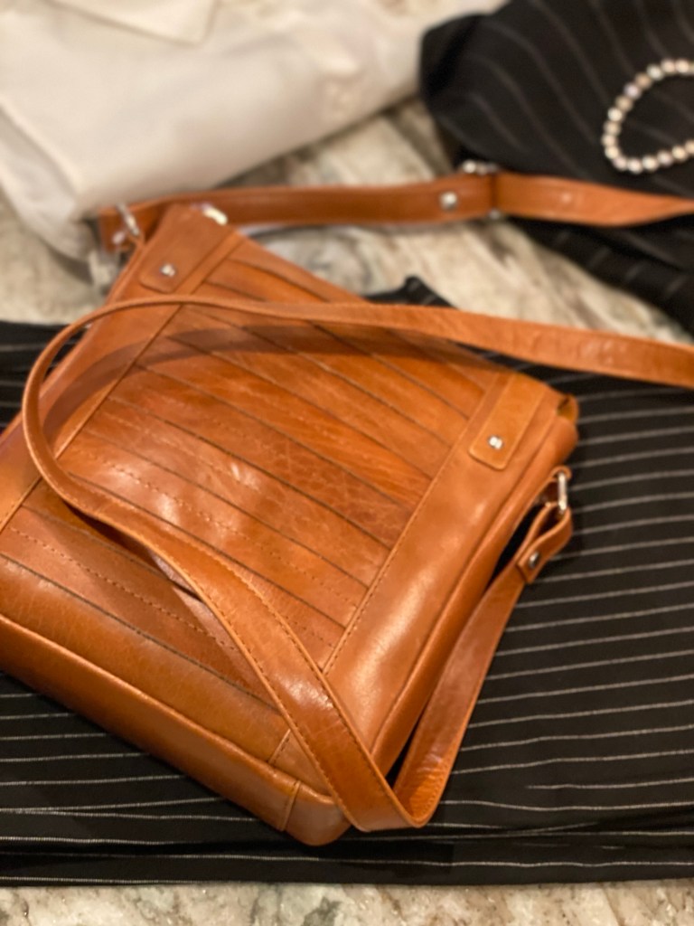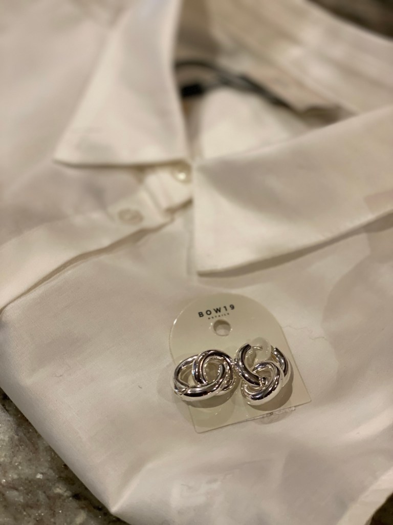 Den randiga toppen en bralla med massor av stretch och en krispig vit krage . Halsband med tre rader av silverfärgade kulor .