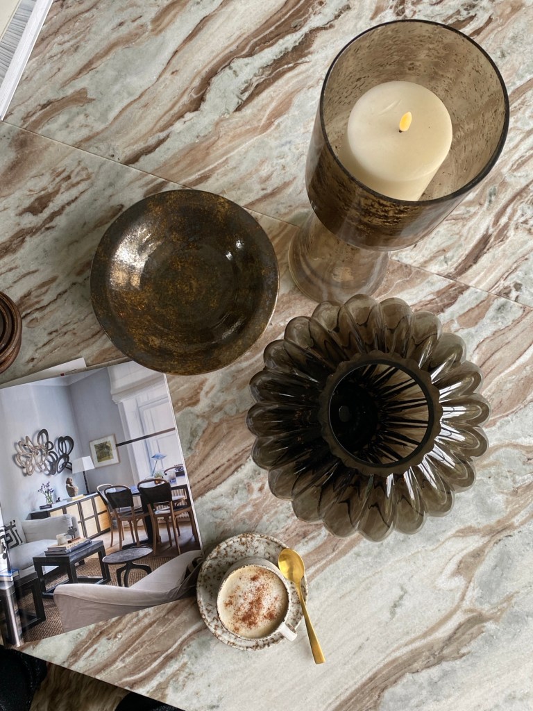 Metallerna är av mässing och koppar för en jordnära känsla och ytor av marmor eller tavertin.
