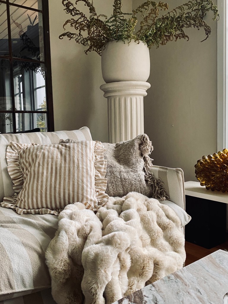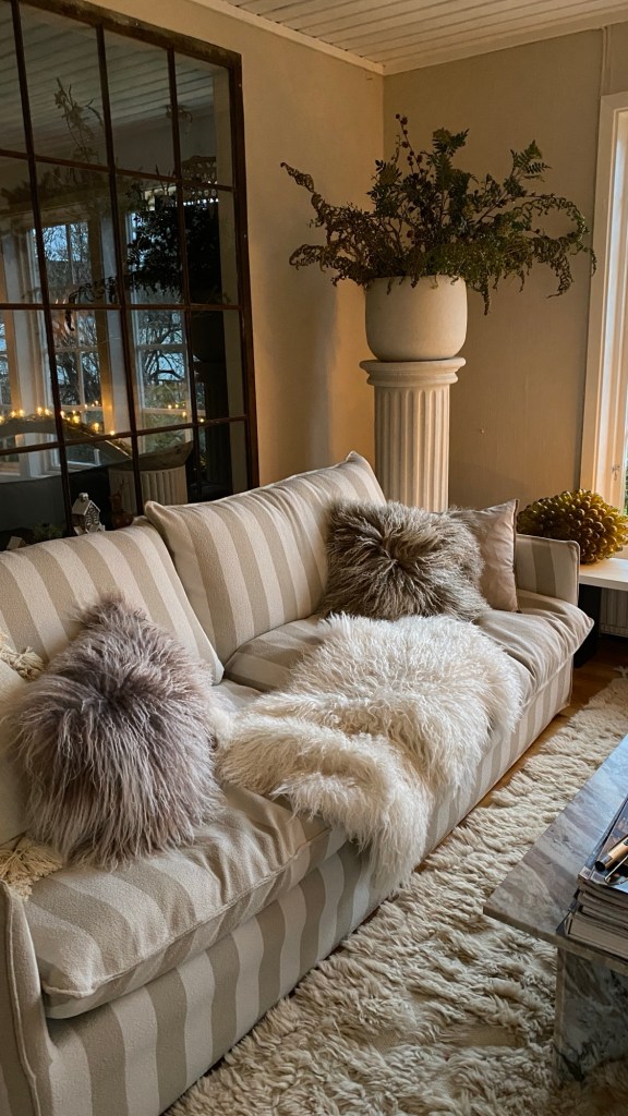 Jag vill behålla den mysiga känslan men gå över mer mot en känsla av vinterfint. Är sugen på att hänga upp en hellång svepande gardin på väggen bredvid fönstret.