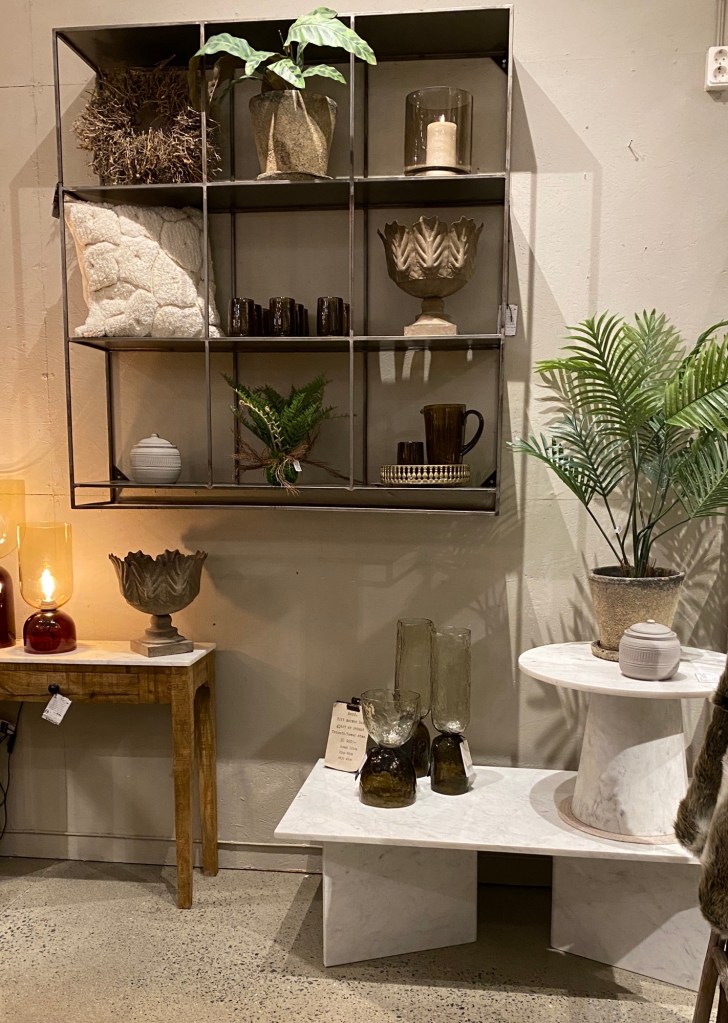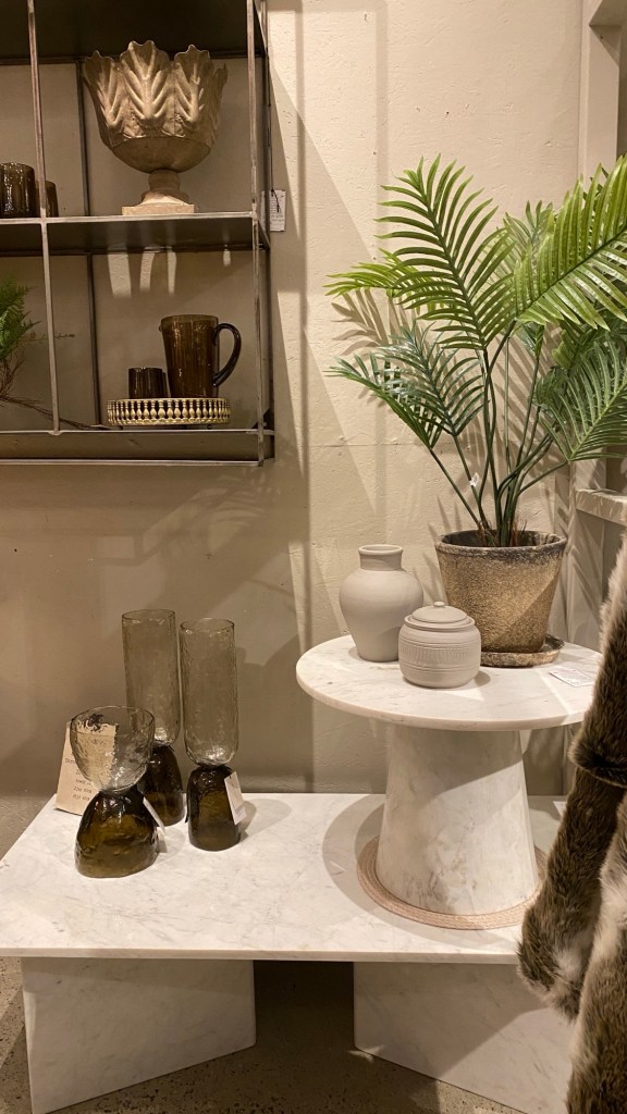 Det har inretts fler miljöer också. Här har vi samlat några krukor på fot, en rustikare kruka med fat, en spegelbricka med bruna glas och en tillbringare och de fantastiska borden av marmor.