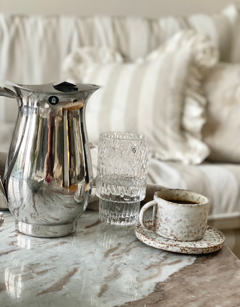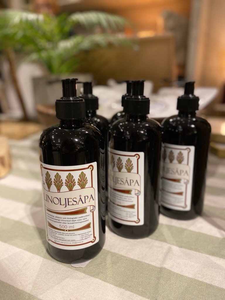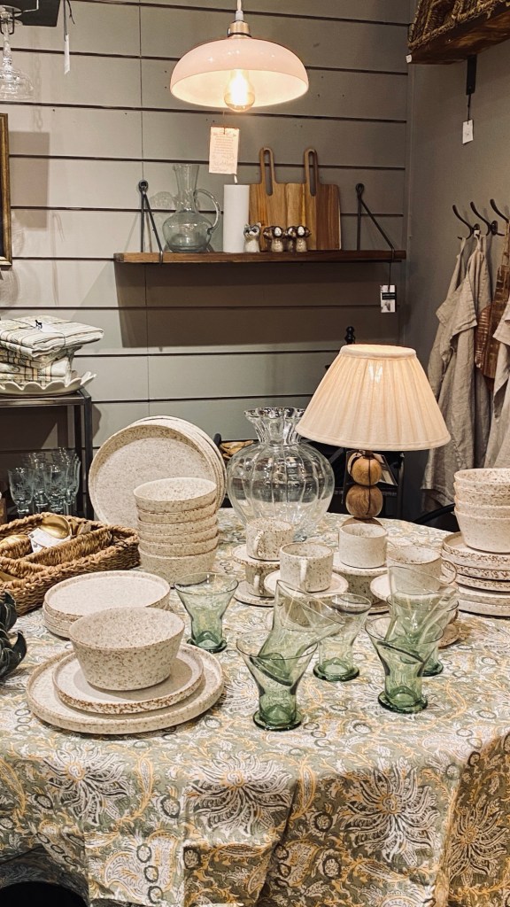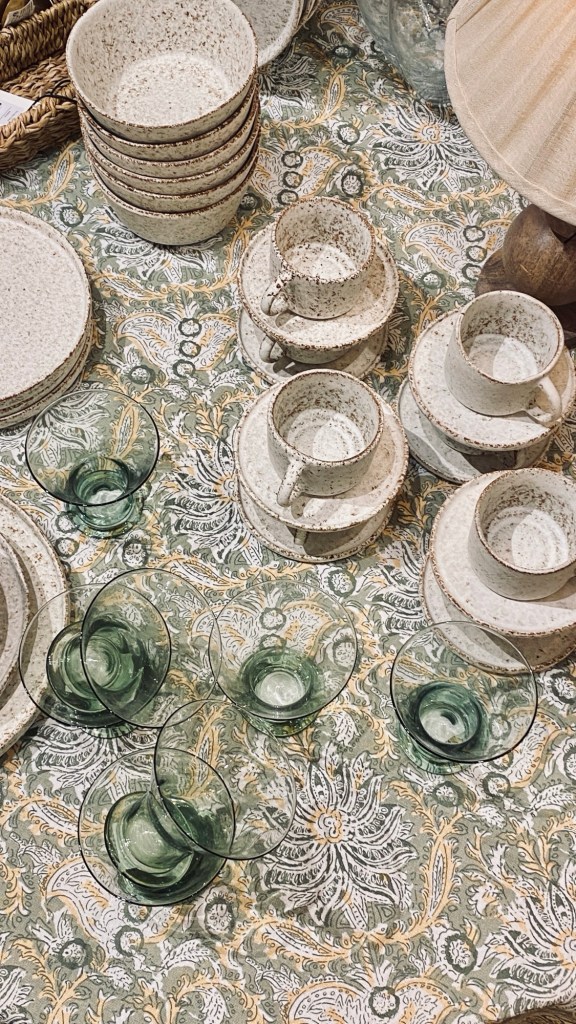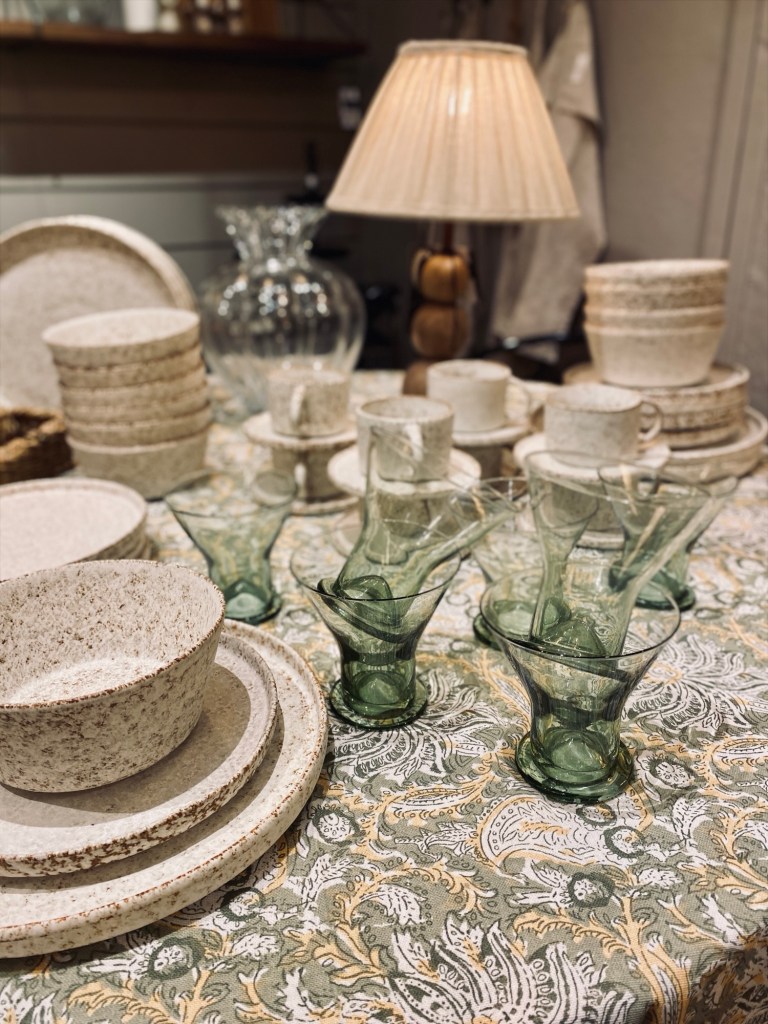 Efter några minuter med pappa så kikar jag in i köket i butiken . Bordet dukas av och får sej en ny underbart fräsch duk. Blev så fint med den ljusa serien och de grön munblåsta glasen till. Lampfoten i trä och skärmen av linne blev fin till .