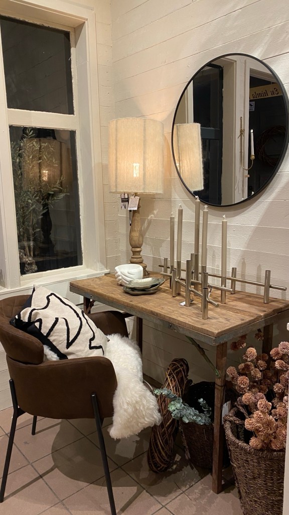 Sedan går tiden fort. Jag hjälper till att plocka ner beställda lampor från lagret och jag hinner flytta några häng med kläder.Ännu ett bord dukas om och upp i ett av våra moderum . Helt plötsligt har klockan slagit fyra och det är dags att stänga de stora dubbeldörrarna för den här dagen.