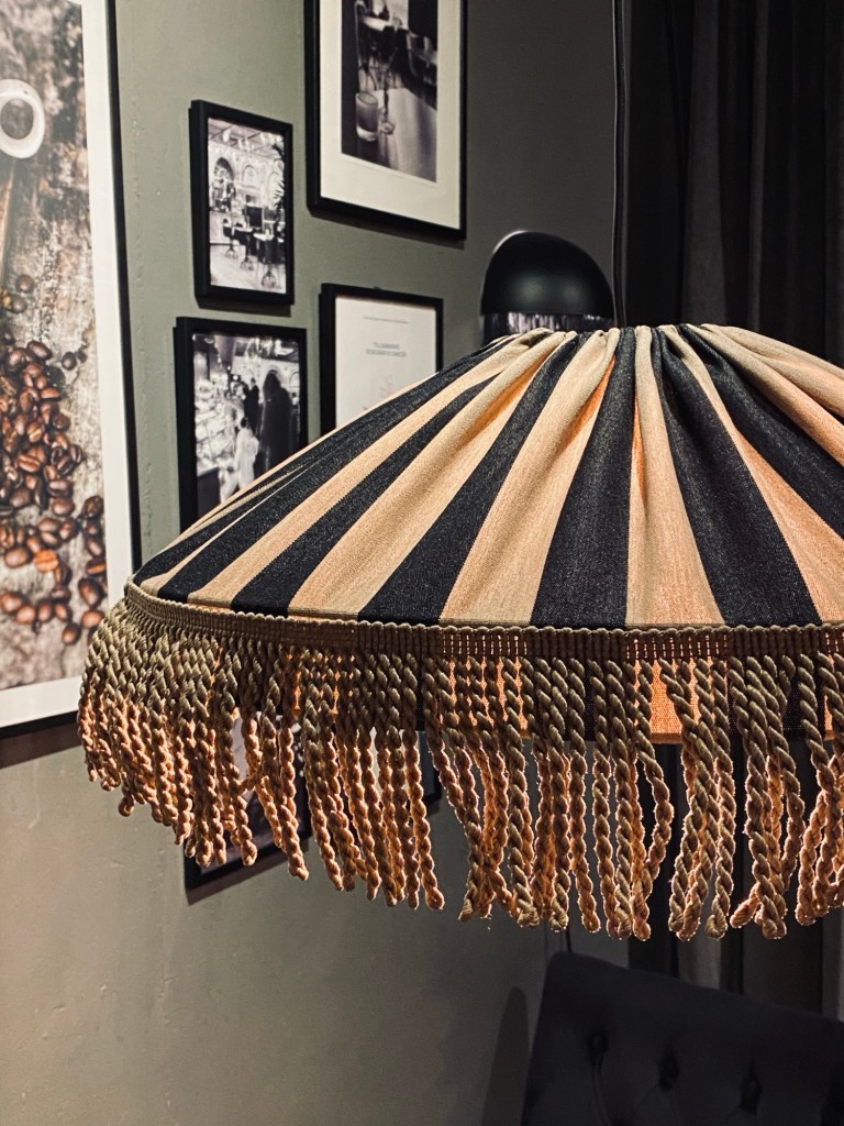 Lördagen i butiken och cafeet blev helt galet speedad och kreativiteten var på högvarv hela dagen. Jag började med att hänga upp två av de nya lampskärmarna över borden i ”vippen” som är ett av cafeets tre mysiga rum .Visst blev det fint.